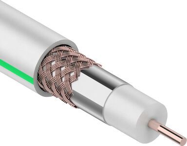 Наиболее качественным и эффективным решением для установки и подключения спутниковой телевизионной системы. Он отлично передает высокочастотные видео и аудио сигналы и прокладывается внутри помещений. Этот коаксиальный кабель состоит из центрального проводника и двойного экрана, размещенных соосно. Внутренний одножильный проводник изготовлен из высококлассной меди и помещен в полиэтиленовый диэлектрик, способствующий сохранению соосного расположения проводников. Диаметр проводника 1,02 мм. Алюминиевый экран, наложенный на сердечник, имеет дополнительную плотную медную оплетку и благодаря этому надежно защищает передаваемый сигнал от внешних помех. Номинальное волновое сопротивление кабеля – 75 Ом. Внешняя оболочка изготовлена из ПВХ и имеет белый цвет. Длина - 100м.