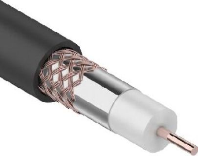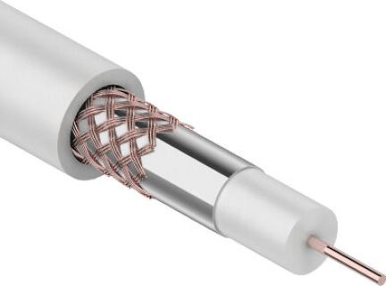 Кабель с металл. однопроволочной жилой, изоляция из вспененного полиэтилена, снабжен экраном, наложенным на сердечник и дополнит. оплеткой из металлических проволок, оболочка кабеля сплошная из ПВХ. бухта 100 м, цвет белый, макс. рабочее напряж. 2,8 кВ