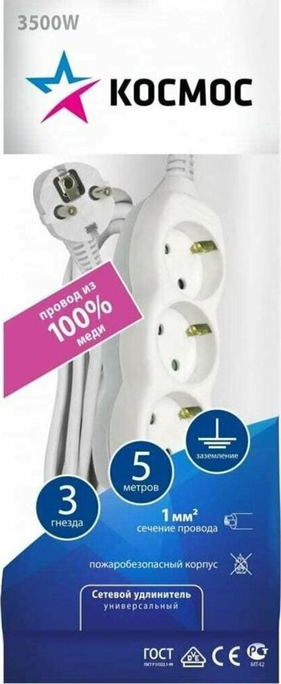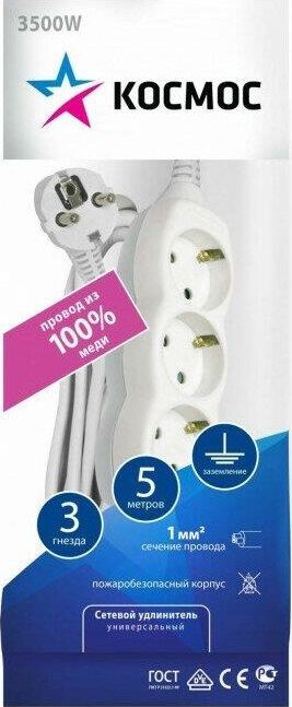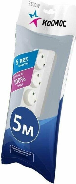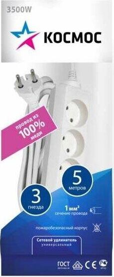 5метра,3розетки,ПВС 2х1м2 до 1300Вт (16А,220В)