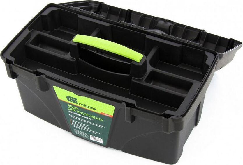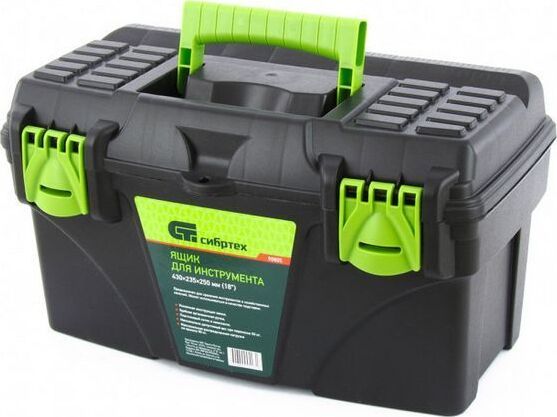 СИБРТЕХ Ящик для инструмента 18" 430х235х250 мм, пластик 90805 Материал полипропилен Габариты 430 x 235 x 250 мм Особенности наличие лотка Ящики для инструмента СИБРТЕХ — это современный внешний вид, стильное цветовое решение и необычная шагреневая фактура пластика, приятная на ощупь. Многочисленные ребра жесткости придают корпусу дополнительную прочность, благодаря чему ящик устойчив к падениям на твердые поверхности и выдерживает нагрузку до 100 кг. Ящик оборудован эргономичной ручкой для переноски, а петли крышки и ручки выдерживают его загрузку до 50 кг. С помощью трехрядных петель усилена конструкция замков и верхней крышки. Также, у ящиков СИБРТЕХ продумано внутреннее пространство: для хранения мелких деталей и небольшого инструмента имеется пластиковый вкладыш с ручкой. На корпусе крышки всех моделей нанесена линейка в дюймах и сантиметрах, что позволяет оперативно делать необходимые замеры.