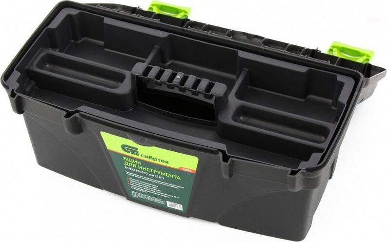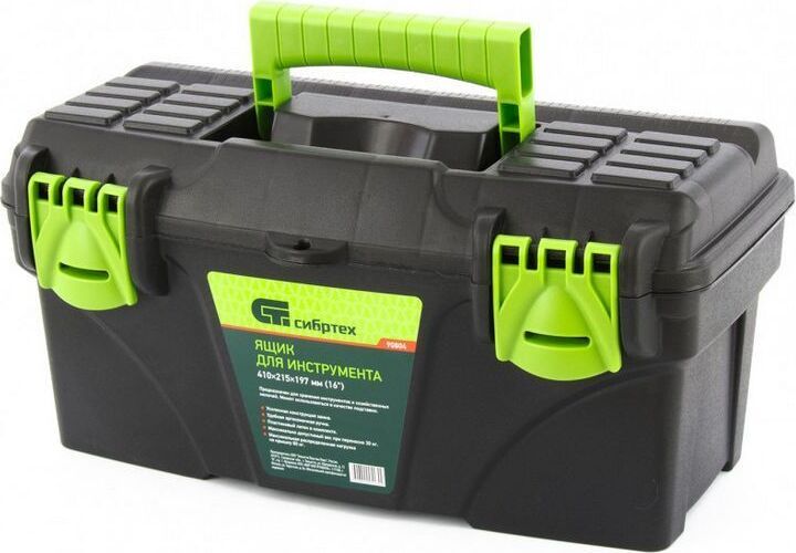 СИБРТЕХ Ящик для инструмента 16" 410х215х197 мм, пластик 90804 Материал полипропилен Габариты 410 x 215 x 197 мм Особенности наличие лотка Ящики для инструмента СИБРТЕХ — это современный внешний вид, стильное цветовое решение и необычная шагреневая фактура пластика, приятная на ощупь. Многочисленные ребра жесткости придают корпусу дополнительную прочность, благодаря чему ящик устойчив к падениям на твердые поверхности и выдерживает нагрузку до 100 кг. Ящик оборудован эргономичной ручкой для переноски, а петли крышки и ручки выдерживают его загрузку до 50 кг. С помощью трехрядных петель усилена конструкция замков и верхней крышки. Также, у ящиков СИБРТЕХ продумано внутреннее пространство: для хранения мелких деталей и небольшого инструмента имеется пластиковый вкладыш с ручкой. На корпусе крышки всех моделей нанесена линейка в дюймах и сантиметрах, что позволяет оперативно делать необходимые замеры.