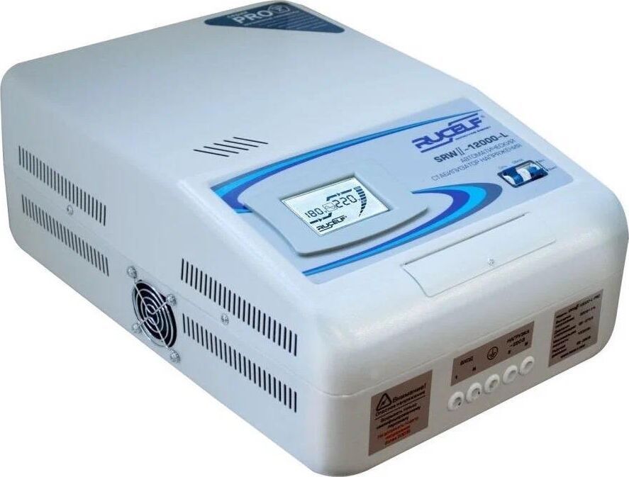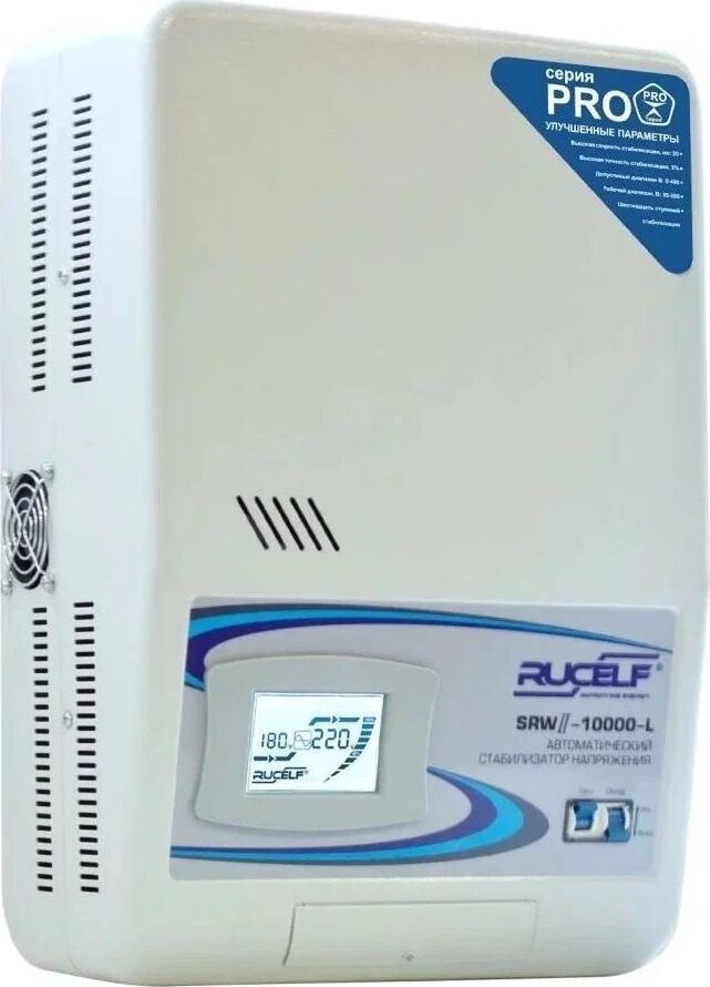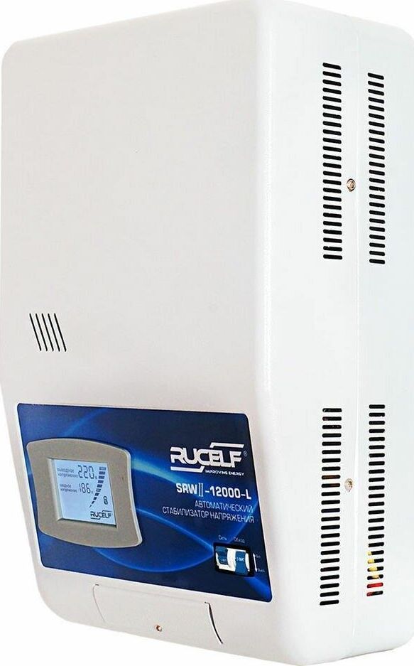 "Тип стабилизации: Релейный Диапазон стабилизации: 110-270 В Рабочий диапазон: 95-280 В Точность стабилизации: ±8% Мощность: 10000 ВА Стабилизатор напряжения SRW II-10000 предназначен для автоматической регулировки напряжения. Использует ступенчатые тип регулировки и имеет индикацию всех важных параметров на жидкокристаллическом дисплее. Стабилизатор напряжения SRW II-10000 — инновационный продукт в линейке надежных стабилизаторов RUCELF. Микропроцессор нового уровня в сочетании с шестью скоростными реле позволяют прибору мгновенно реагировать на изменение входного напряжения. Имеет повышенную степень защиты и высокую точность стабилизации. Современный дизайн и компактные размеры — неоспоримое преимущество при размещении стабилизатора в любом интерьере."