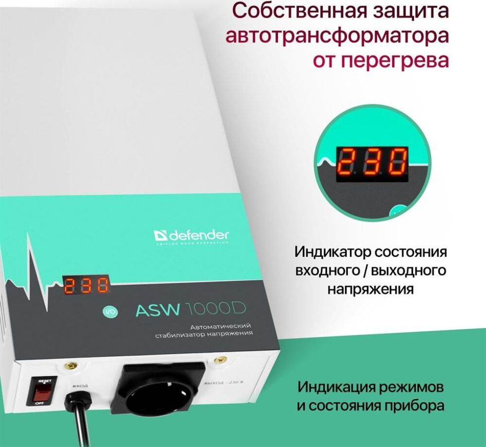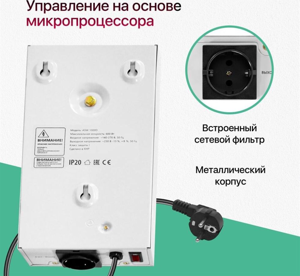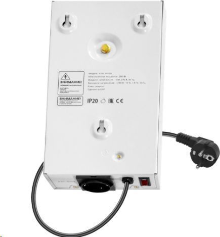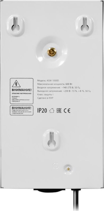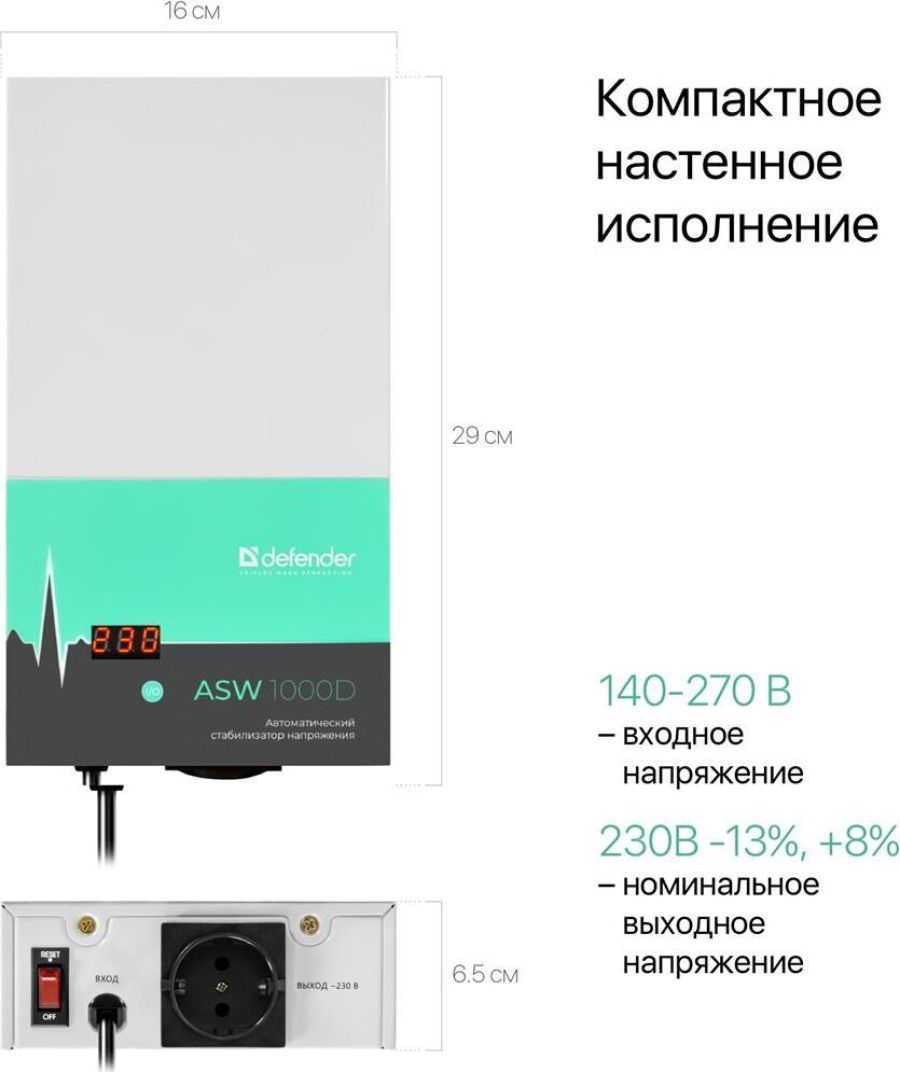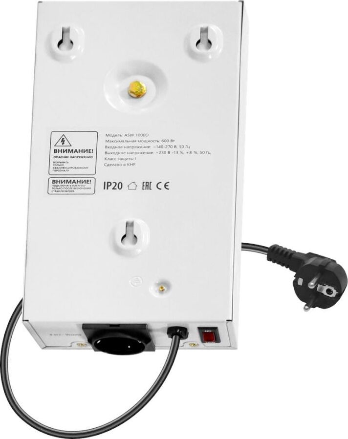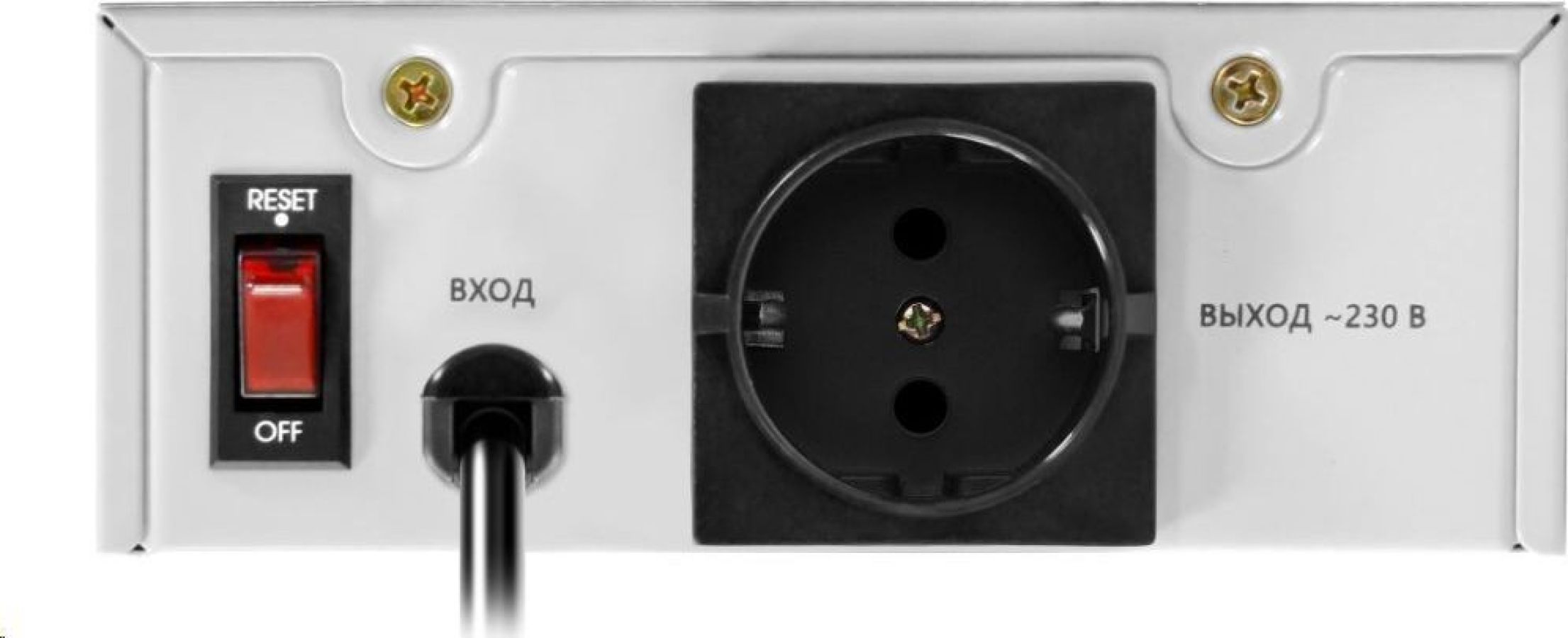 Максимальная полная мощность при входящем напряжении 220В: 1000 ВА, Максимальная полная мощность при входящем напряжении 170В: 600ВА, Номинальное выходное напряжение 230В -13%, +8%, Номинальная частота переменного тока: 50 Гц, Число фаз: 1,Время переключения: 20 мс, Защитные функции: Защита от повышенного напряжения, Защита от пониженного напряжения, Защита от перегрева, Защита от перегрузки, Диапазон входного напряжения: 140–270 В, Крепление на стену, Размеры без упаковки: 29.0 x 6.5 x 16.0 см.