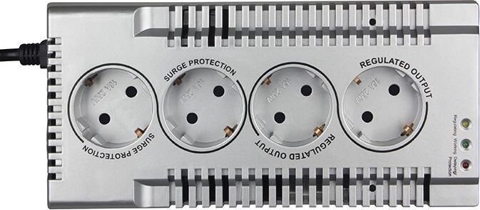 Стабилизатор напряжения релейного типа, 320Вт, 4 розетки, входное напряжение, В ~180 - 285±3 %, выходное напряжение, В ~230 (-14/+10%), ток срабатывания защиты (предохранитель), А - 5, перегрузочная способность, % кратковременная: до 150, долговременная: до 125, защита от повышенного/пониженного напряжения сети, от высоковольтных импульсов, от короткого замыкания и перегрузки, встроенная тепловая защита автотрансформатора, размеры изделия, мм - 230 х120х102.