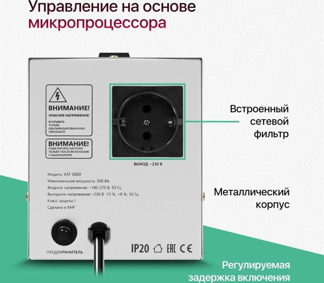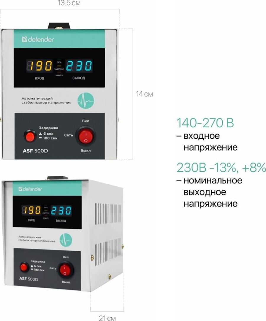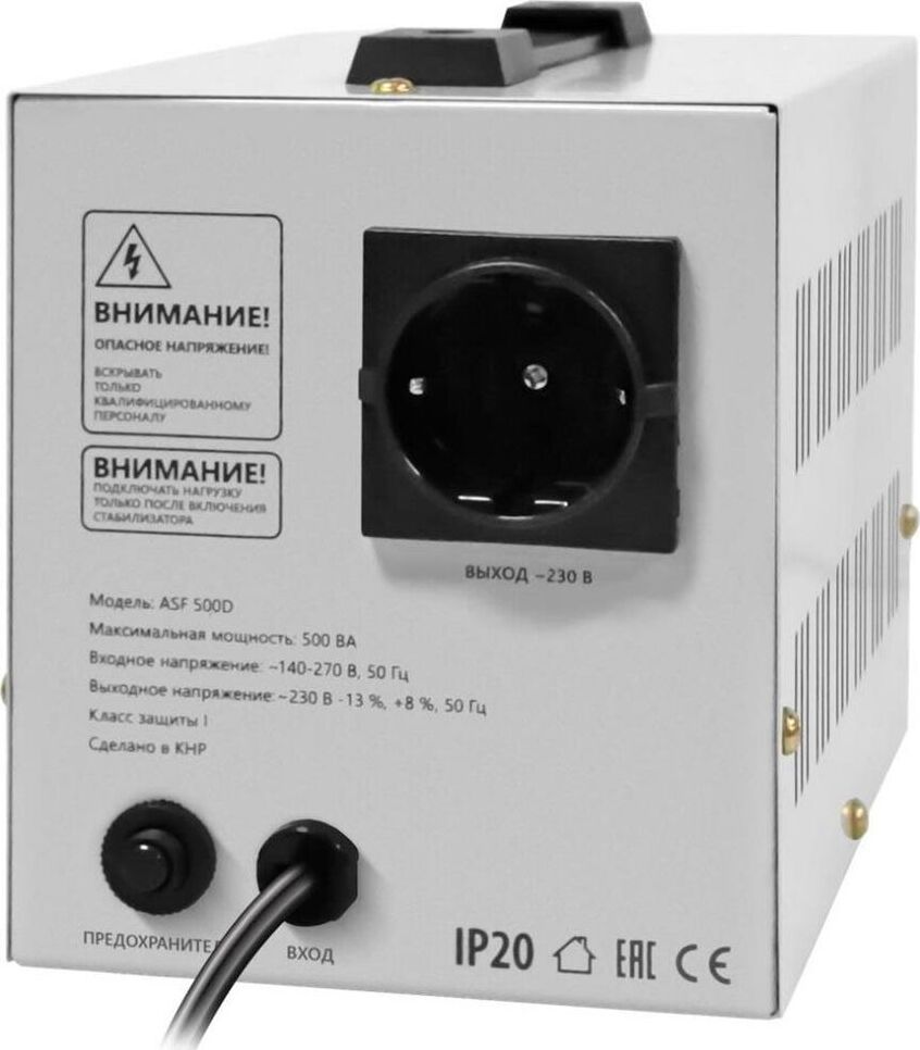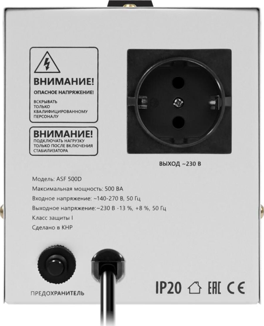 Автоматический стабилизатор напряжения, встроенный сетевой фильтр, мощность при входящем напряжении 220В - 500 ВА, мощность при входящем напряжении 170В - 300 ВА,номинальное выходное напряжение 230В -13%, +8%, номинальная частота переменного тока 50 Гц, число фаз -1, защитные функции: - защита от повышенного напряжения, от пониженного напряжения, от перегрева, от перегрузки, диапазон входного напряжения - 140–270 В, способ подключения - штепсельные разъемы типа "F", количество розеток - 1 шт., розетки с заземлением - 1 шт., дисплей LED, габаритные размеры - 16.3 x 22.2 x 12.4 см.