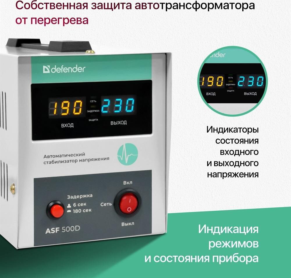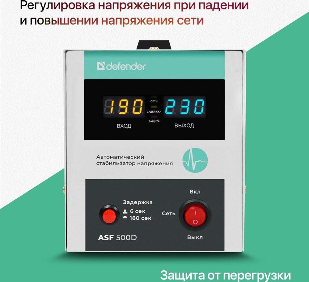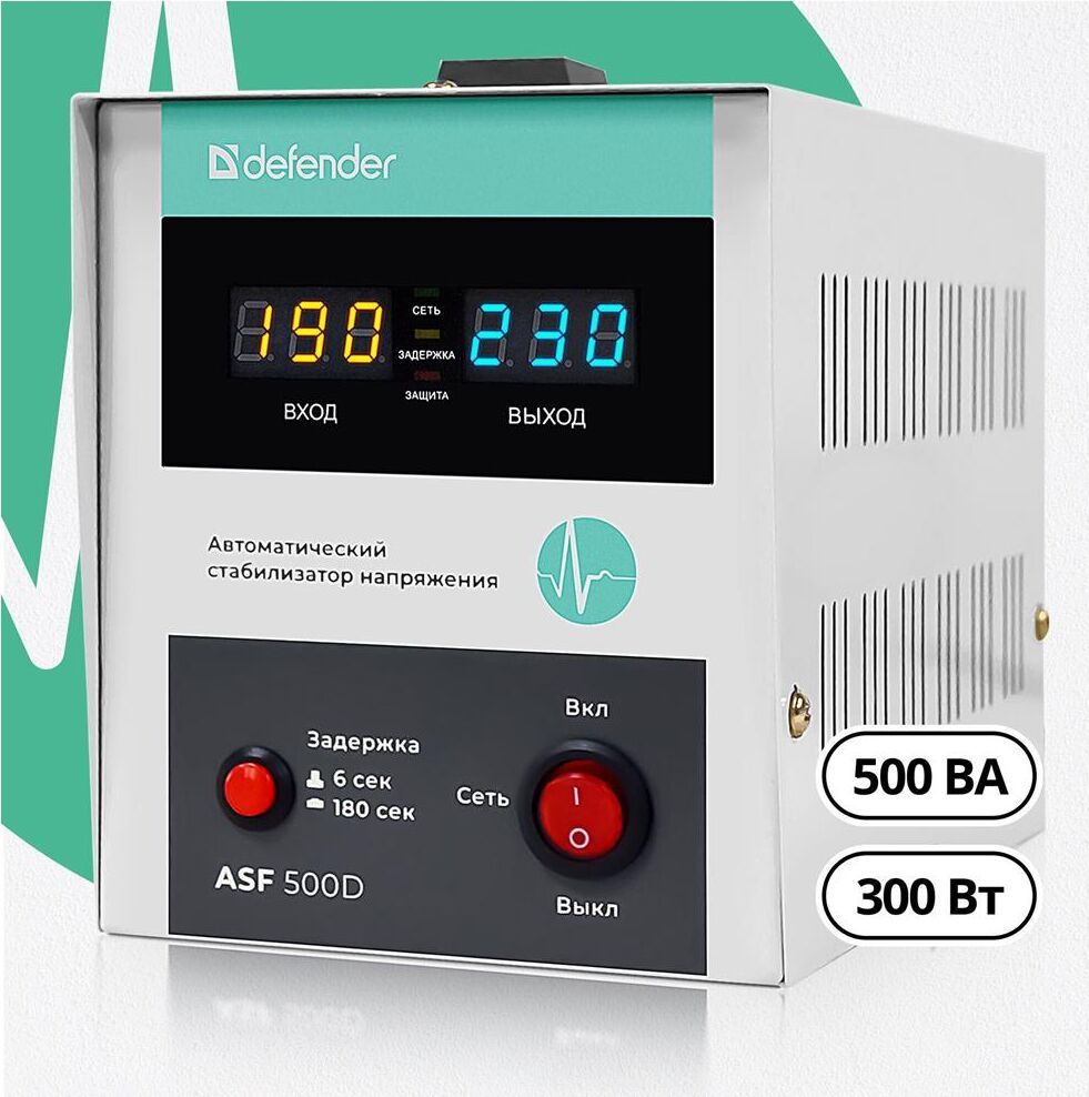 Автоматический стабилизатор напряжения, встроенный сетевой фильтр, мощность при входящем напряжении 220В - 500 ВА, мощность при входящем напряжении 170В - 300 ВА,номинальное выходное напряжение 230В -13%, +8%, номинальная частота переменного тока 50 Гц, число фаз -1, защитные функции: - защита от повышенного напряжения, от пониженного напряжения, от перегрева, от перегрузки, диапазон входного напряжения - 140–270 В, способ подключения - штепсельные разъемы типа "F", количество розеток - 1 шт., розетки с заземлением - 1 шт., дисплей LED, габаритные размеры - 16.3 x 22.2 x 12.4 см.