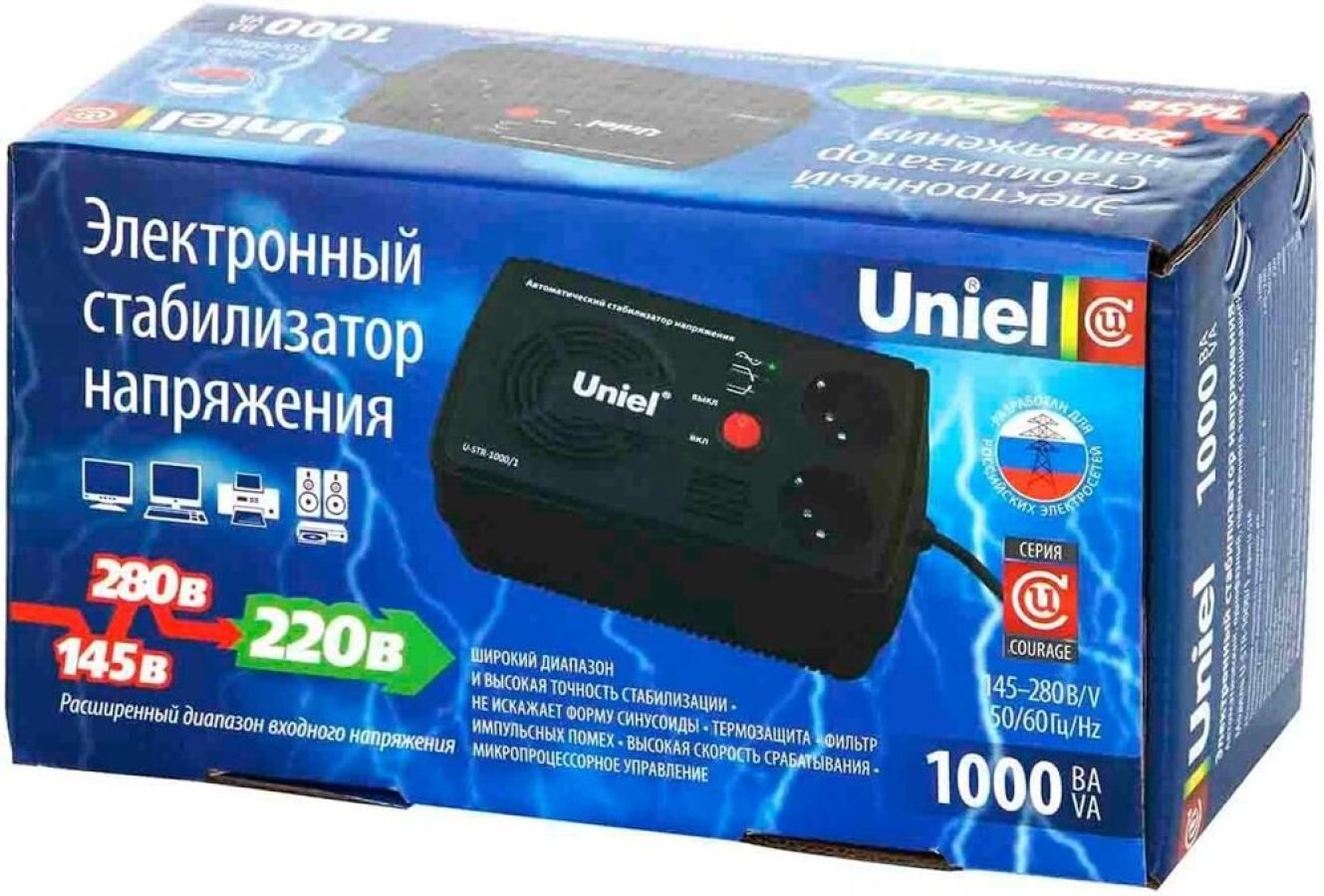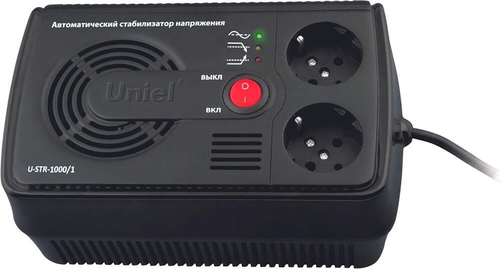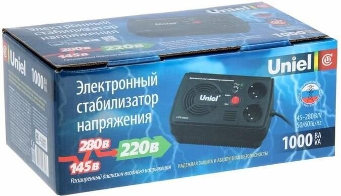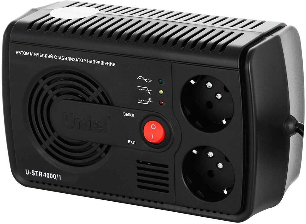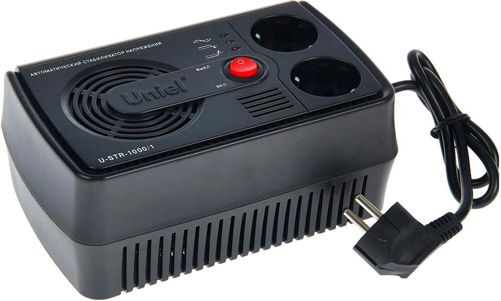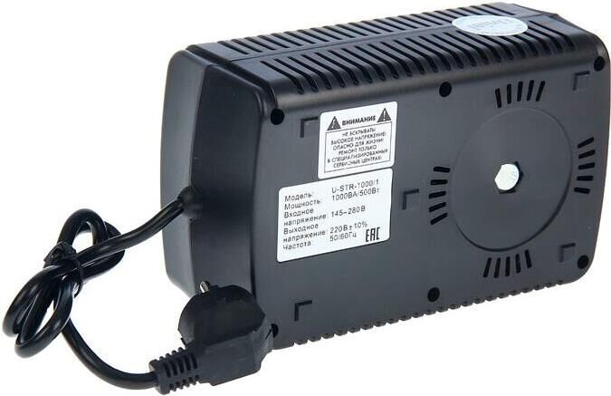 Однофазный электронны(релейный) стабилизатор,номинальная мощность 1,0кВА,диапазон входного напряжения 145-280В,выходное напряжение 220+/-10%В,частота 50/60Гц,точность стабилизации 10%,Макс.ток 4,6А, 20мс. Размер: 213x125x92мм.