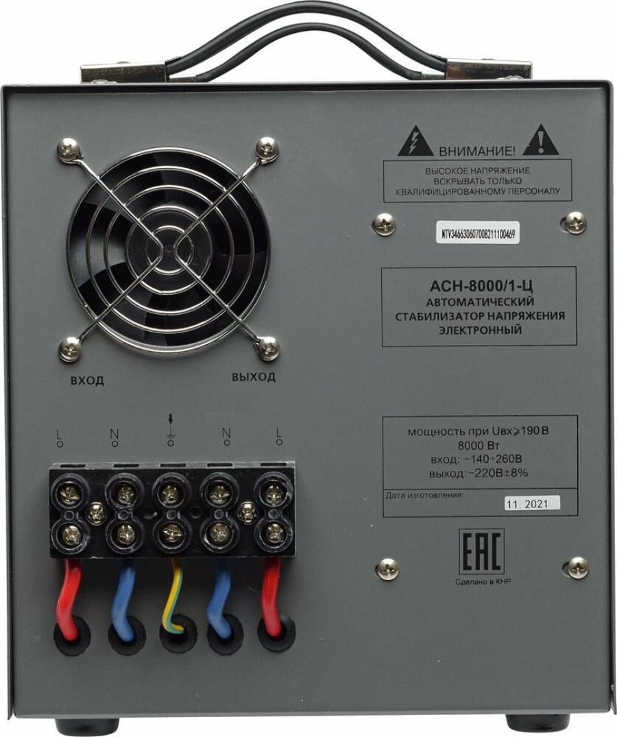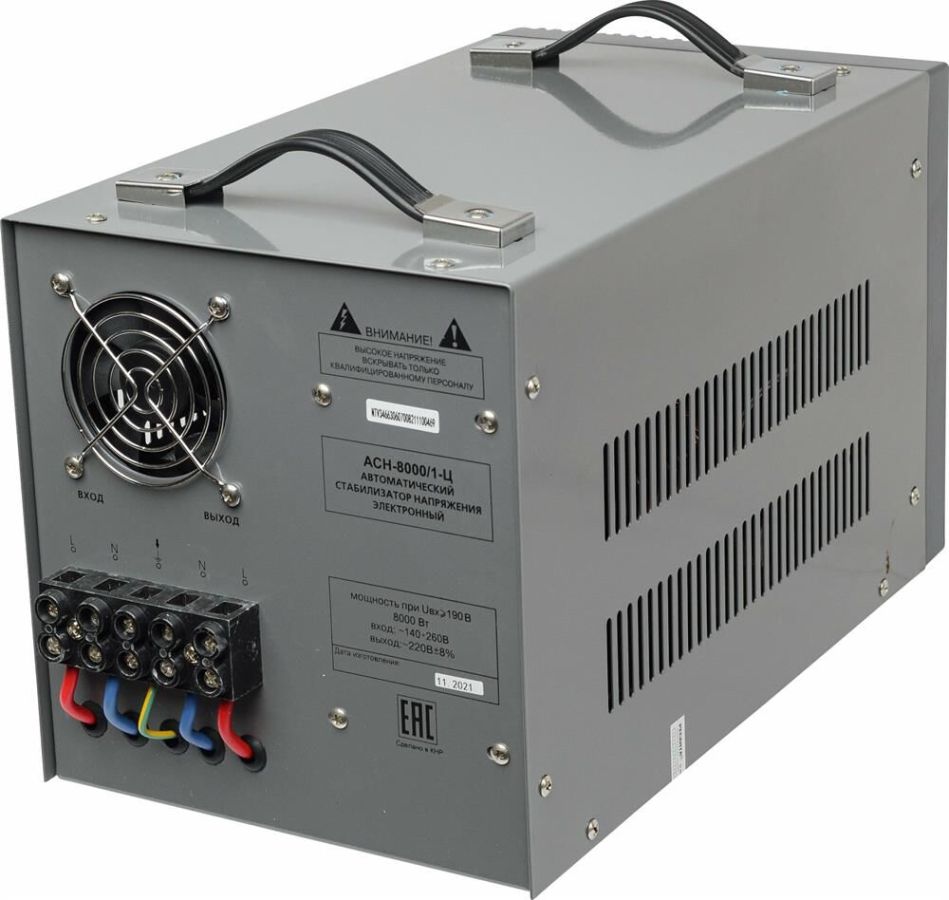 Номинальная мощность 8 000Вт, Тип двигателя Релейный, производство Китай, Серия АСН, Тип напряжения Однофазное (220 В), Размещение Напольное, Время отклика 7мс, Скорость стабилизации 35В/с, Охлаждение Естественное, Класс защиты IP20, Влажность воздуха 80%, КПД 97%, Точность стабилизации 8%, Выходное напряжение 202-238В, Рабочая температура 5-40°C, Частота 50Гц, Защита от короткого замыкания, от перегрева, от повышенного напряжения, от помех