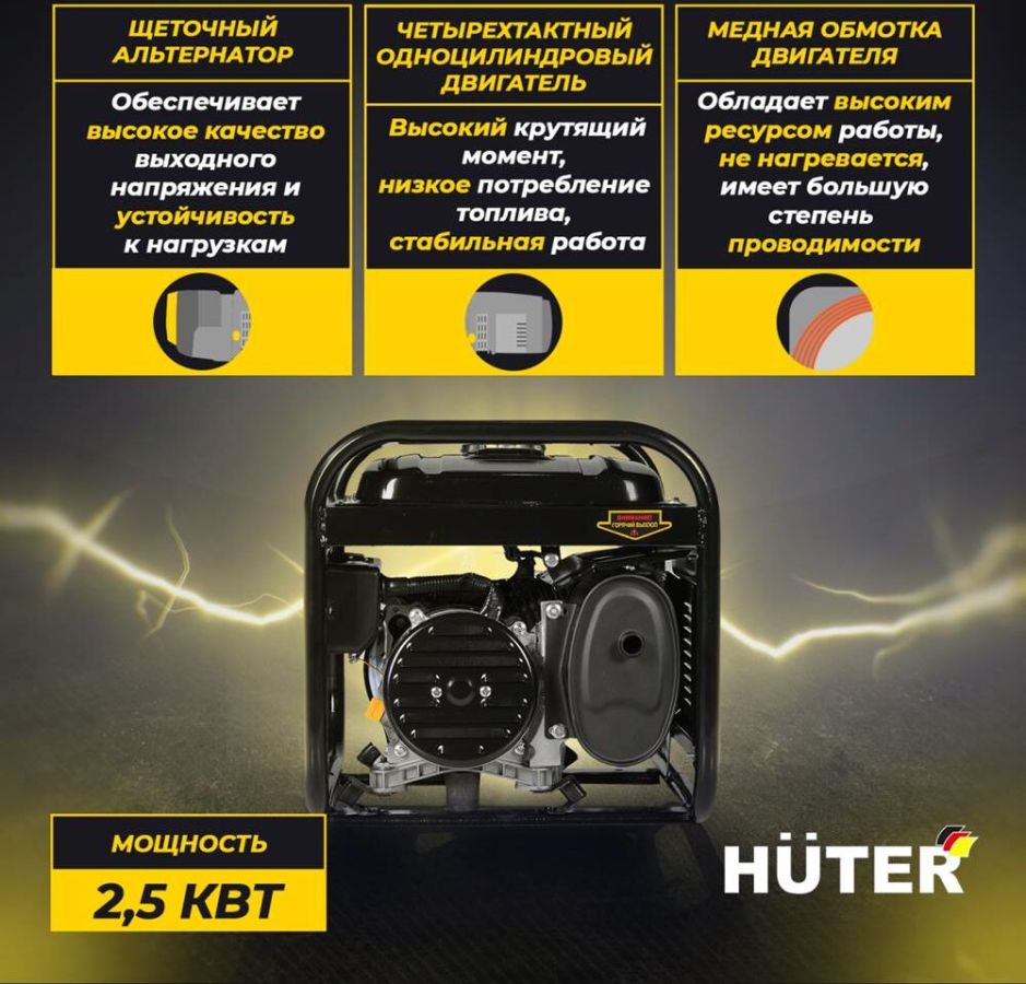 Напряжение, В 220. Стартер ручной. Max мощность, кВт 2,7. Емкость топливного бака, л 12. Мощность номинальная при 220 В, кВт 2,5. Альтернатор синхронный. Производитель двигателя Huter. Модель двигателя 168f-2. Автозапуск (АВР) нет. Свеча зажигания NGK BP5ES. Дисплей нет. Обмотка альтернатора двигателя медь. Тип кожуха открытый. Вид топлива бензин. Мощность максимальная при 220 В, кВт 2.7. Аккумулятор в комплекте нет. Расход топлива, л/ч 1.3. Уровень шума, дБ 67. Тип двигателя 4-х тактный. Степень защиты IP23. Контроль напряжения компаундный (традиционный). Колеса и ручки нет. Индикатор уровня топлива да. Выход 12V нет. Датчик масла да. Тип электростанции туристические.