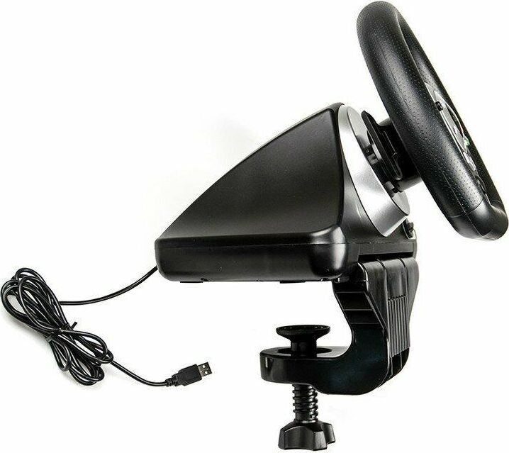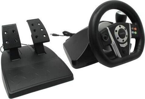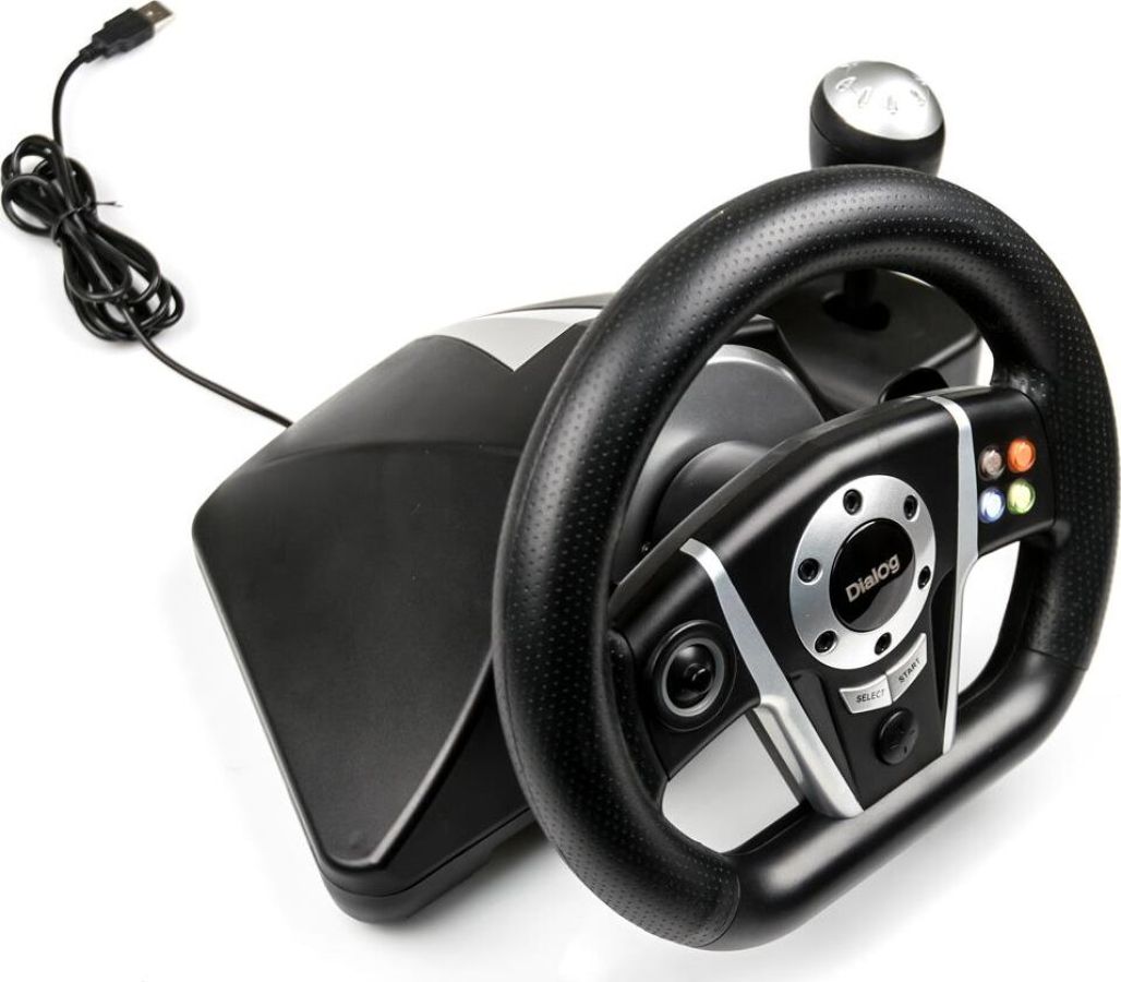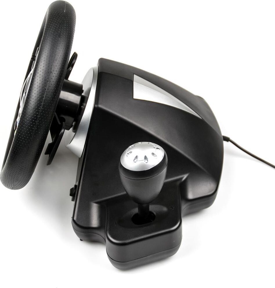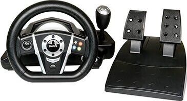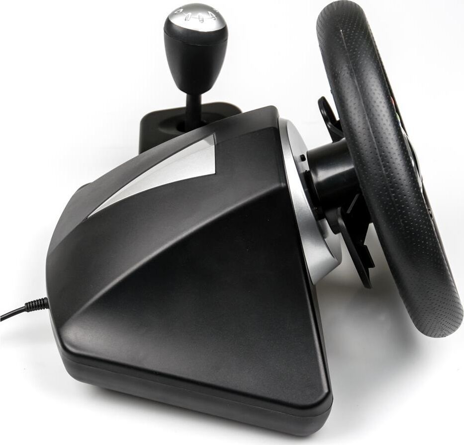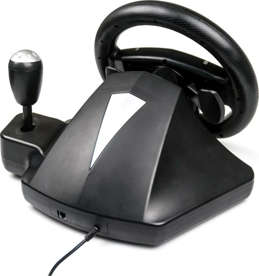 Джойстик-руль, с эффектом вибрации, интерфейс USB, двухпозиционный рычаг переключения скоростей. На рулевом колесе: 2 подрулевых лепестка для переключения скоростей, 8-позиционная навигационная крестовина, 4-кнопочная крестовина управления, крупная кнопка в центре, 2 кнопки Select и Start и четырехкнопочная крестовина в нижней части рулевого колеса.