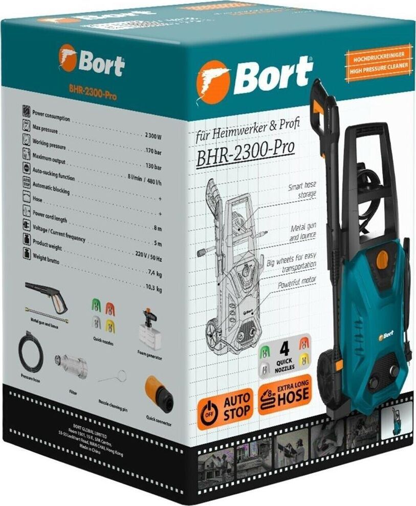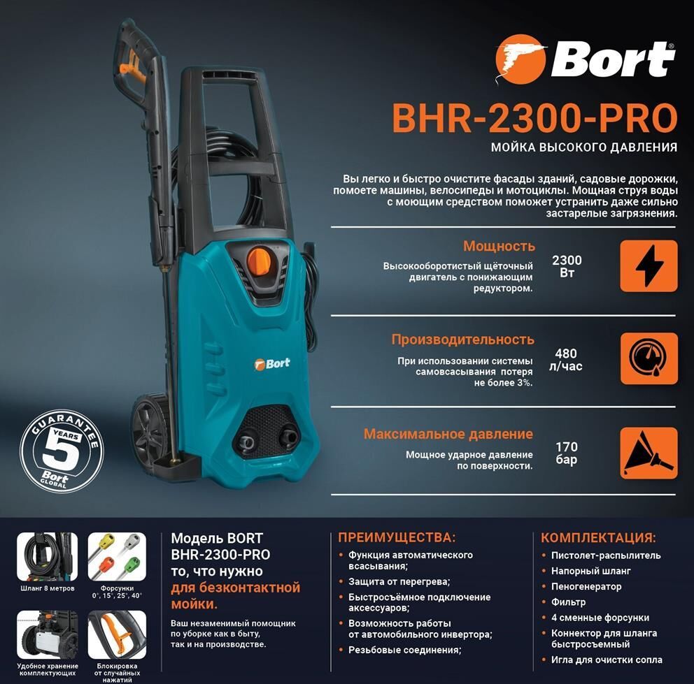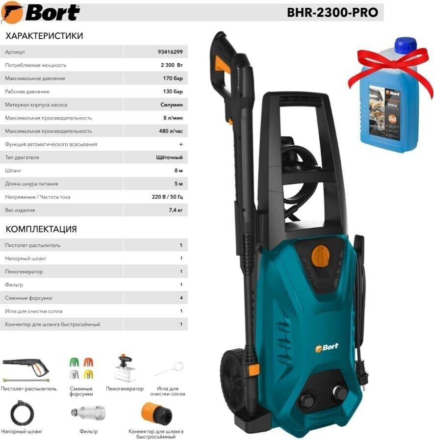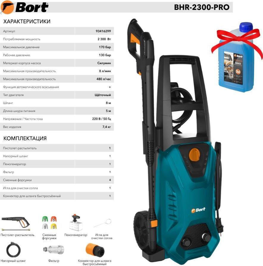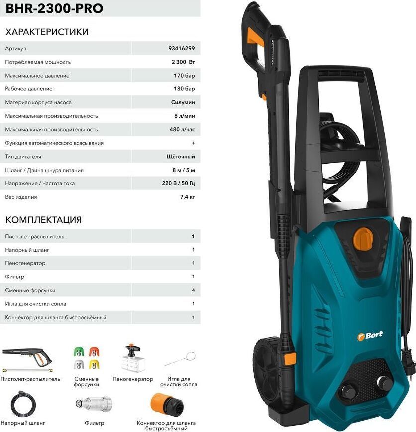 Мойка высокого давления; Потребляемая мощность 2300 Вт; Максимальное давление 170 бар; Рабочее давление 130 бар; Материал корпуса насоса Силумин;Максимальная производительность 480 л/час; Функция автоматического всасывания; автостоп; Шланг 8 м; Длина шнура питания 5 м; Напряжение 220 В; Частота тока 50 Гц; Вес изделия 7,4 кг; Вес брутто=10,3 (Вес нетто=9,1) кг; 35 x 32,1 x 50; набор аксессуаров 10 шт; Функция самовсасывания, Быстросъемное подключение аксессуаров, Автоматическое отключение при перегреве., Увеличенная длина шланга 8м; гарантия 2 г