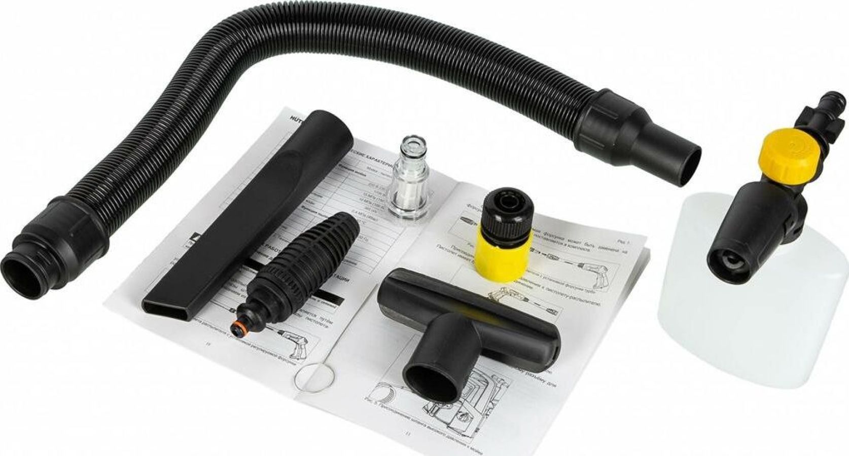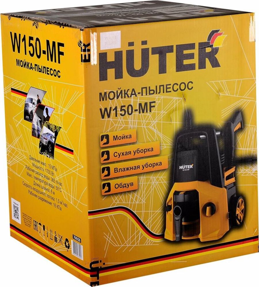 Мощность: 1,7 кВт. Напряжение: 220 В. Частота: 50 Гц. Тип двигателя: электрический, щеточный. Максимальное давление: 150 бар. Рабочее давление: 100 бар. Расход воды: 365 л/ч. Материал помпы: алюминий. Длина кабеля: 5 м. Длина шланга: 8 м. Барабан для шланга: нет. Тип пеногенератора: бытовой. Максимальное давление поступающей воды: 4 бар. Максимальная температура воды: 50 °С. Забор воды из емкости: есть. Мощность в режиме пылесоса: 1 кВт. Рабочее разряжение: 16 КПа. Скорость воздушного потока: 1,5 м3/мин. Режим работы пылесоса: всасывание и выдувание. Колеса: есть. Габаритные размеры, ДхШхВ: 370x360x470 мм.