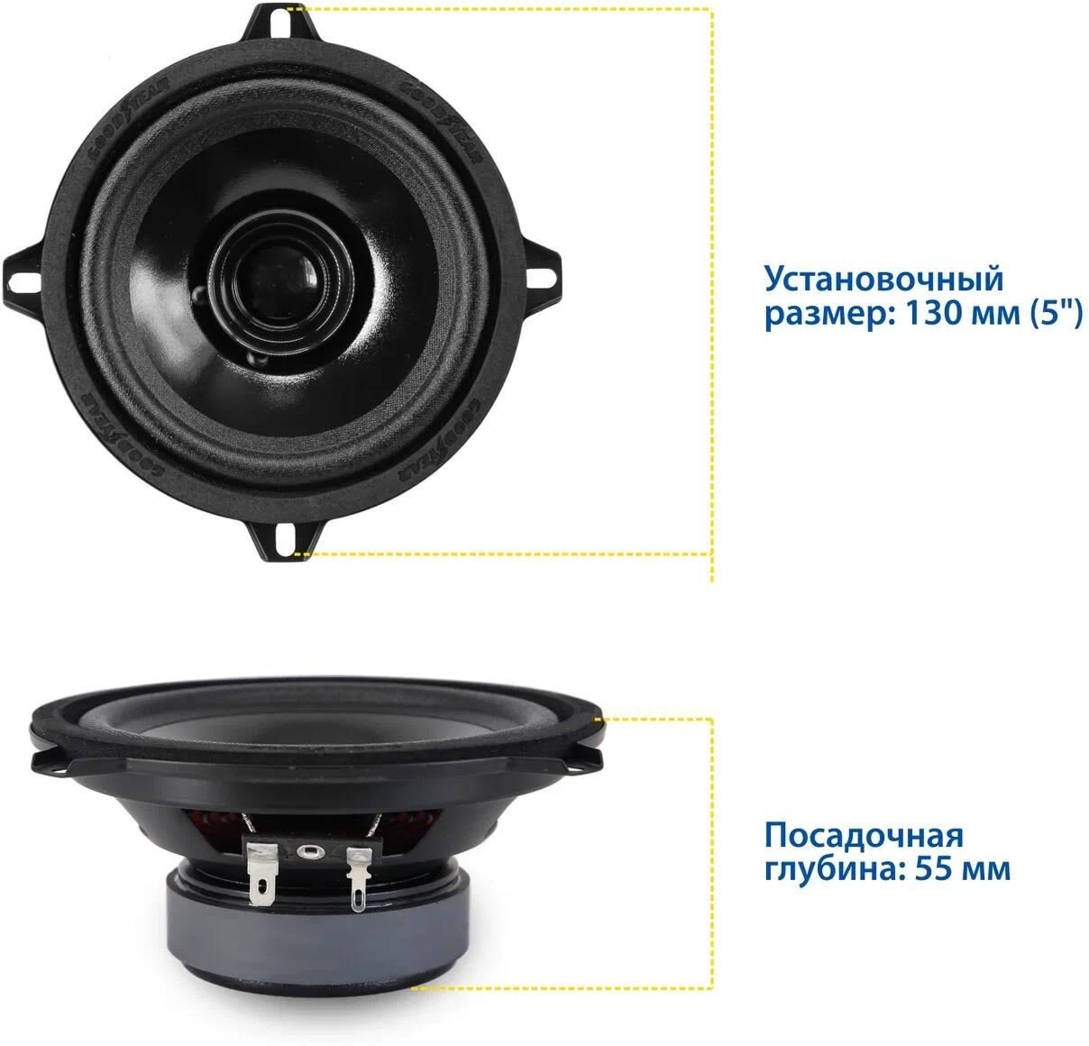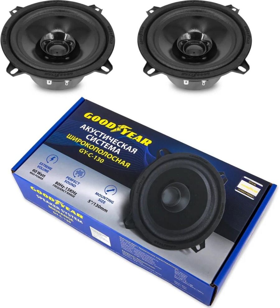 Широкополосные автомобильные колонки Goodyear GY-С-130 предназначены для замены оригинальных динамиков либо для автомобилей с аудиоподготовкой и являются отличным вариантом для систем с штатной магнитолой или стандартным головным устройством. Широкополосная акустическая система Goodyear GY-С-130 – это 2 автомобильные колонки с мощностью 60 Вт. В одном корпусе объединены основной динамик и высокочастотный, что позволяет добиться насыщенного и чистого звучания в широком диапазоне частот 80 Гц – 15 КГц. Система «Extreme volume», сочетающая в себе высокую чувствительность динамиков 91,1 дБ и сопротивление 4 Ом, позволяет добиться экстремальной громкости даже при минимальной мощности головного устройства. Диффузоры автомобильных колонок Goodyear GY-С-130 изготовлены из акустической бумаги с полимерным покрытием, что обеспечивает насыщенные и глубокие басы. Прочные тканевые подвесы дополнены специальной пропиткой, что влияет на увеличение срока службы. GY-С-130 (арт.: GY020005) – размер: 5", мощность: 60 Вт, диапазон частот: 80 Гц – 15 КГц)