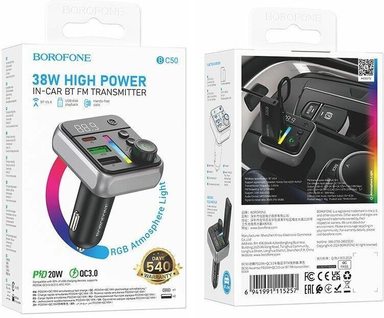 BOROFONE — это универсальный автомобильный трансмиттер с быстрой зарядкой, который позволяет Вам наслаждаться качественным звуком и удобством во время поездок. Трансмиттер BOROFONE BC50 оснащен Bluetooth-адаптером, который позволяет легко и быстро подключаться к Вашему смартфону или другому устройству через Bluetooth. Вы сможете слушать музыку, аудиокниги без проводов и лишних усилий. Кроме того, устройство оснащено двумя USB-портами и портом Type-C. Вы также можете подключить TF-карту, чтобы воспроизводить музыку или другие файлы непосредственно с неё. BOROFONE BC48 также оснащен встроенным FM-модулятором, который позволяет передавать звук на частоту FM и принимать его на радио Вашего автомобиля. Компактный дизайн и прочный корпус делают BOROFONE BC50 удобным и долговечным аксессуаром для Вашего автомобиля. Он легко устанавливается в прикуриватель и не занимает много места. Благодаря своей универсальности, BOROFONE BC48 совместим с большинством автомобилей и устройств.