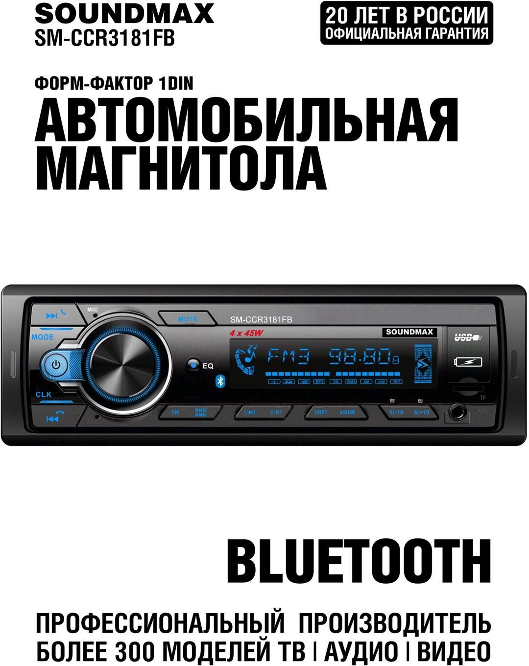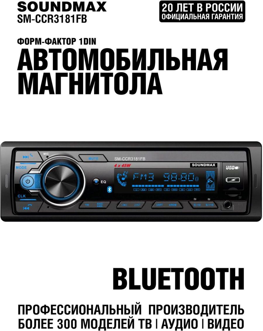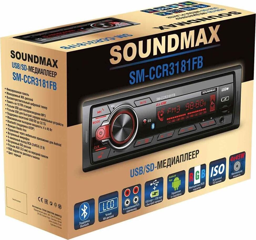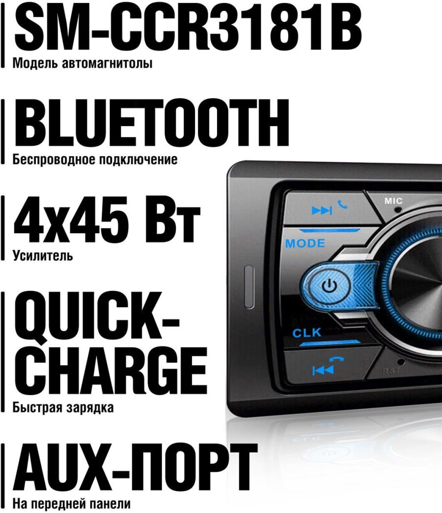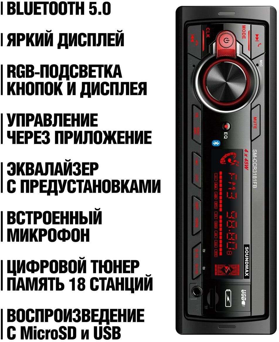 FM-радио + Воспроизведение форматов MP3 Управление из мобильного приложения Android/IOS Диапазон частот FM 87,5—108 МГц Bluetooth + (аудио, handsfree) Воспроизведение потокового аудиосигнала (A2DP) + Микрофон встроенный Максимальная выходная мощность 4 х 45 Вт Дисплей монохромный ЖК Подсветка кнопок Изменяемая RGB подсветка, 7 цветов Передняя панель фиксированная Поддержка карт памяти microSD Встроенный эквалайзер Classic, Pop, Rock, Flat Наличие USB порта + USB порт + (x2) Встроенные часы + Аудиовход AUX на передней панели Линейный RCA-выход + ISO-разъем + (с кабелем) Комплектация Ресивер, детали для установки, руководство пользователя Пульт дистанционного управления Приложение для Android/IOS Цвет черный