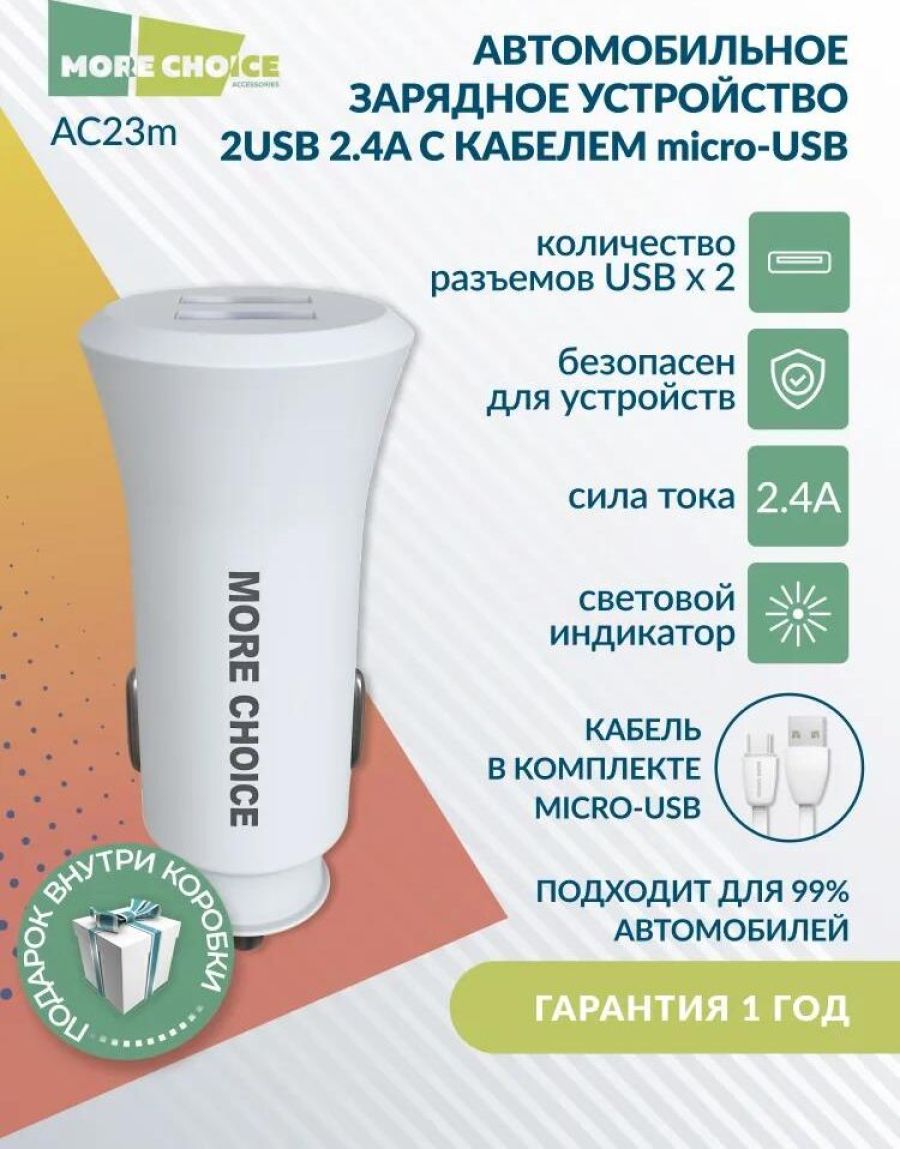 MORE CHOICE AC23m АЗУ 2USB 2.4A для micro USB White