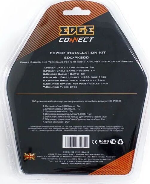 Набор силовой 8Ga для установки автомобильных усилителей Кабель силовой 8Ga оранжевый - 5метров (ССА) Кабель силовой 8Ga черный - 1метр (ССА) Управляющий провод синий 18Ga - 5 метров (ССА) Держатель для предохранителя Mini-ANL - 1 штука Предохраниитель Mini-ANL 40A - 1 штука Кольцо обжимное 8Ga - 2 штуки Вилка обжимная 8Ga - 2 штуки Обжимные трубки для 8Ga - 2 штуки