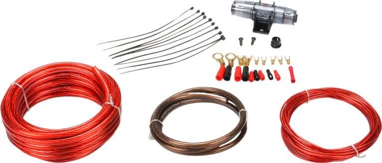 Тип: Профессиональный комплект кабелей для установки автомобильного усилителя. Состав комплекта: Cиловой кабель КС-МТ8 КРАСНЫЙ: 5 метров сечением 8 GA (8,36мм2). Cиловой кабель КС-МТ8 ЧЕРНЫЙ: 1 метр сечением 8 GA (8,36мм2). Держатель с компрессионными зажимами с предохранителем типа MiniANL на 40А: 1шт. Управляющий кабель сечением 18GA (0,82 мм2): 5 метров Клемма кольцевая для силового кабеля сечением 8 GA (8,36мм2): 2 шт. Клемма U-образная для силового кабеля сечением 8 GA (8,36мм2): 2 шт.