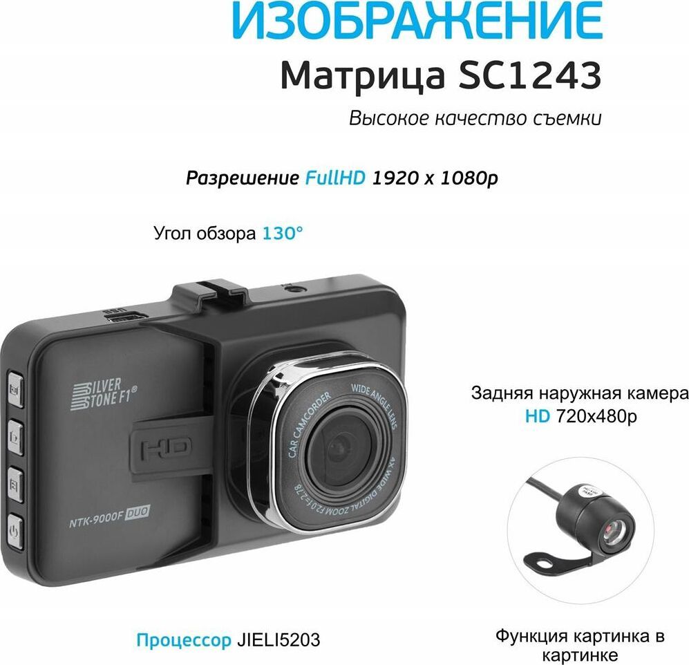 Двухканальное видео высокого качества. Видеозаписи в формате Full HD-видео (1920x1080) при 30 к/с. Прочный металлический корпус. Циклическая запись 2/3/5 мин. MicroHDSC карты (до 32 Гб). Фото до 12 Мп (4352 х 3264). Угол обзора 120 градусов. Дисплей 3.0.