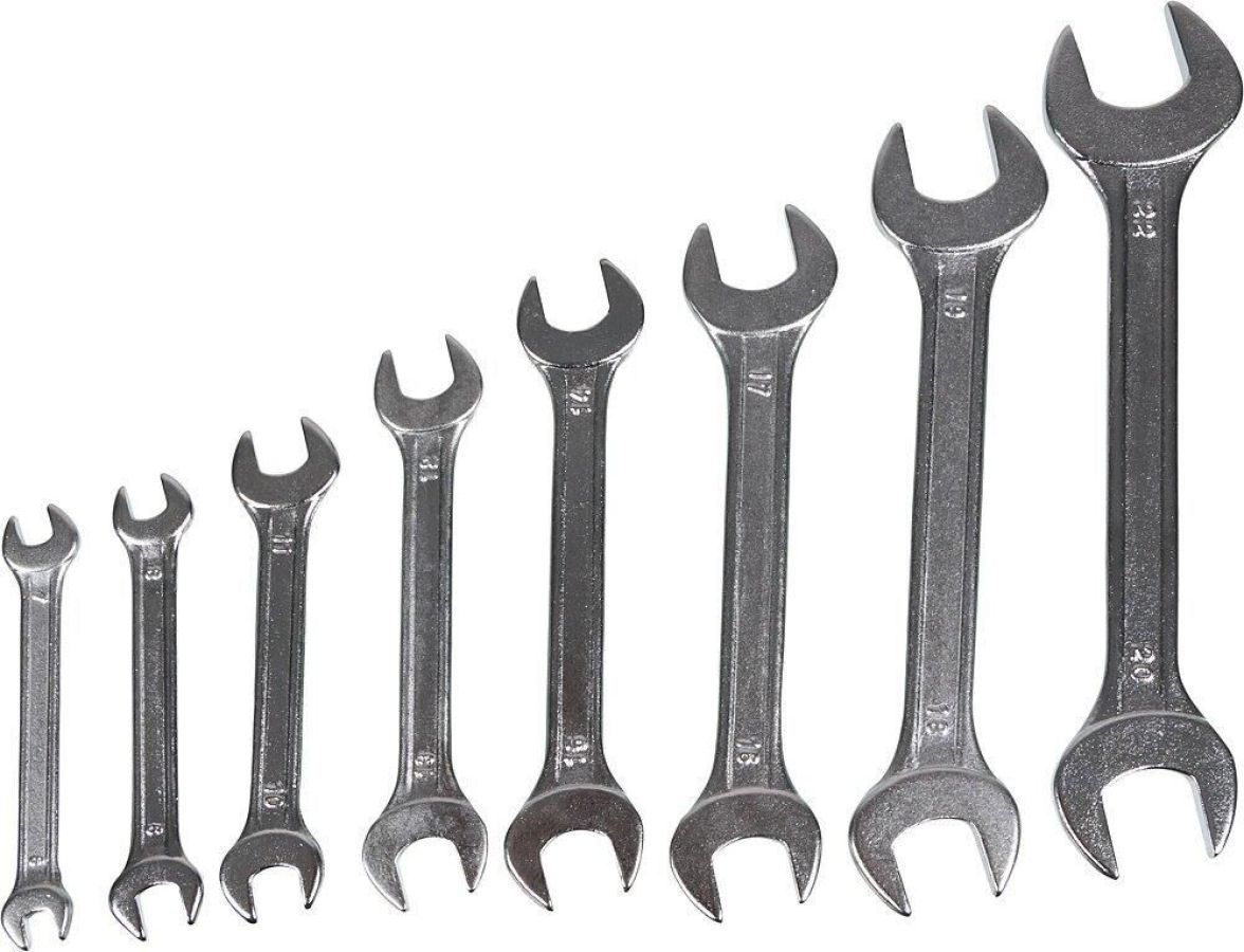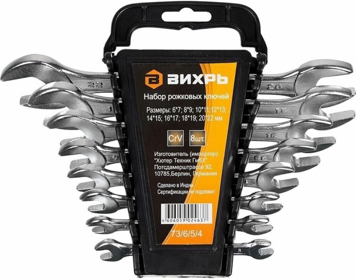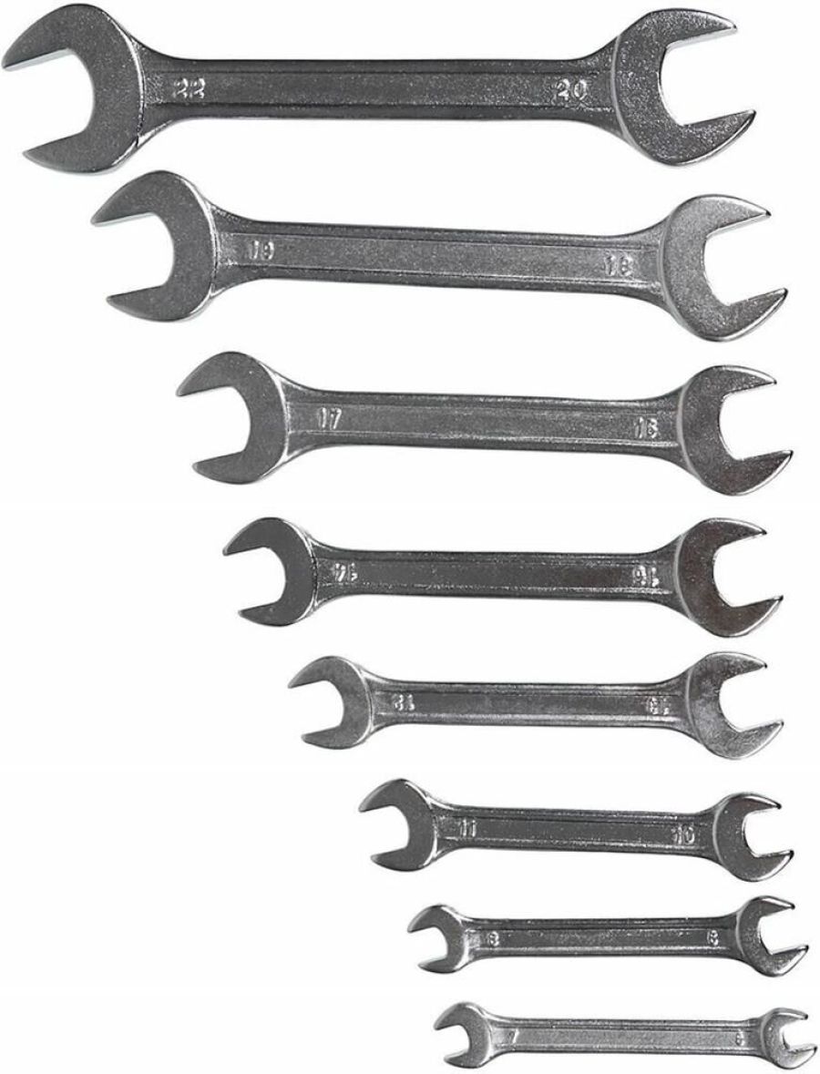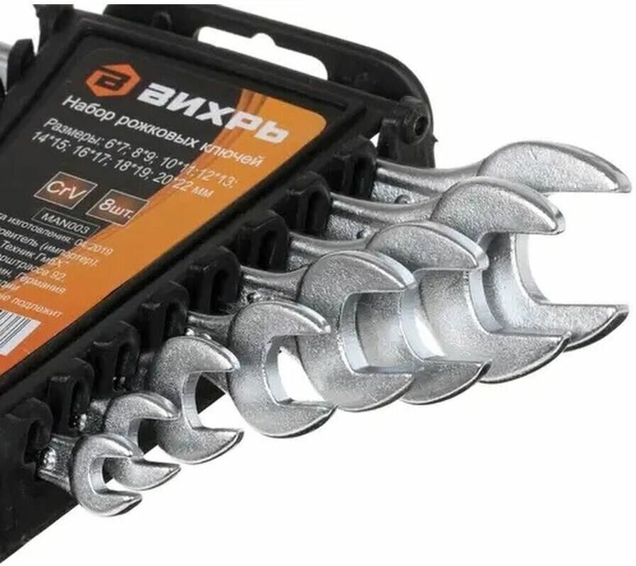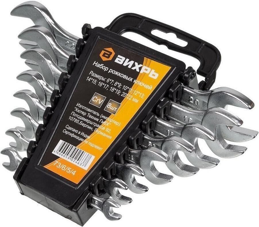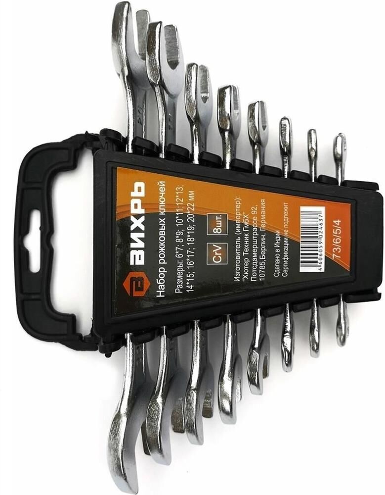Набор рожковых ключей ВИХРЬ включает 8 гаечных ключей, изготовленных из хромованадиевой качественной стали. Имеют хромированное покрытие. Рожковый гаечный ключ - незаменимый инструмент при сборке и разборке любых металлических конструкций, эффективен для работы в труднодоступных местах. Размер ключей: 6 - 22 мм.