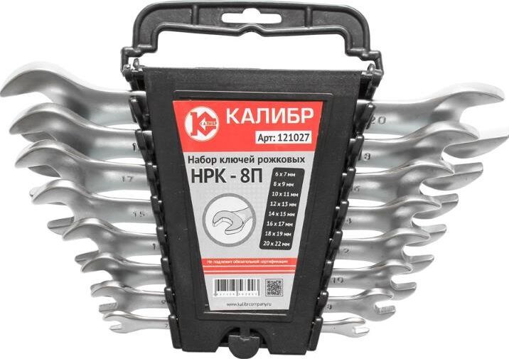 Набор рожковых ключей Калибр НРК-8П, арт.121027 состоит из 6 предметов. Каждый ключ изготовлен из высокопрочной CrV стали. Для удобства хранения набор комплектуется пластиковым подвесом. Рожковые ключи Калибр предназначены для работы с крепежом. Ключи: 6х7, 8х9, 10х11, 12х13, 14х15, 16х17, 18х19, 20х22 мм