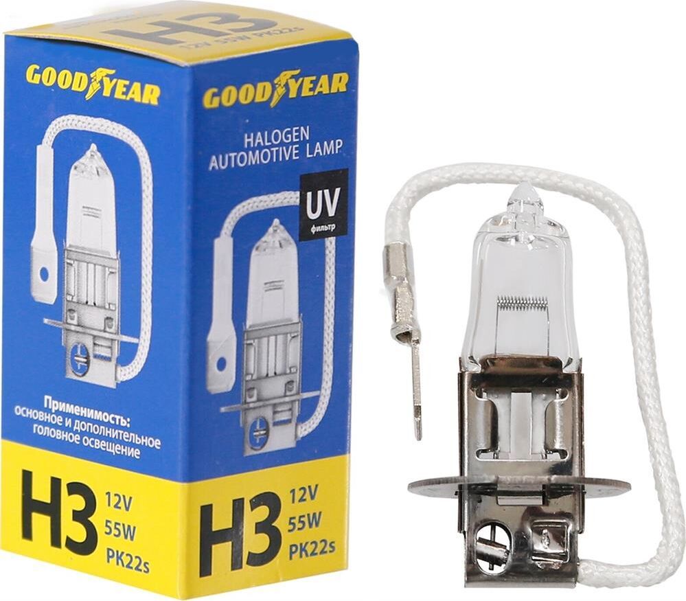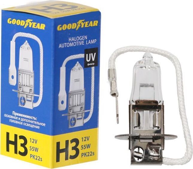 Галогенная лампа используется в фарах ближнего, дальнего освещения и противотуманных фонарях. Соответствуют характеристикам ламп, которыми комплектуются автомобили на конвеере. Для изготовления ламп используется немецкое кварцевое стекло с UV фильтром, который защищает фары от ультрафиолетового излучения. Благодаря этому фара не мутнеет, сохраняя яркость освещения. Лампы Goodyear произведены на автоматизированном оборудовании, что гарантирует сверхточную установку нити накала. Благодаря этому световой поток распределяется равномерно и обеспечивает хороший обзор. " Напряжение: 12В " Мощность: 55Вт " Цоколь: PK22s " " Габариты ДхШхВ: 25х30х60 мм " Вес: 10-12 г.