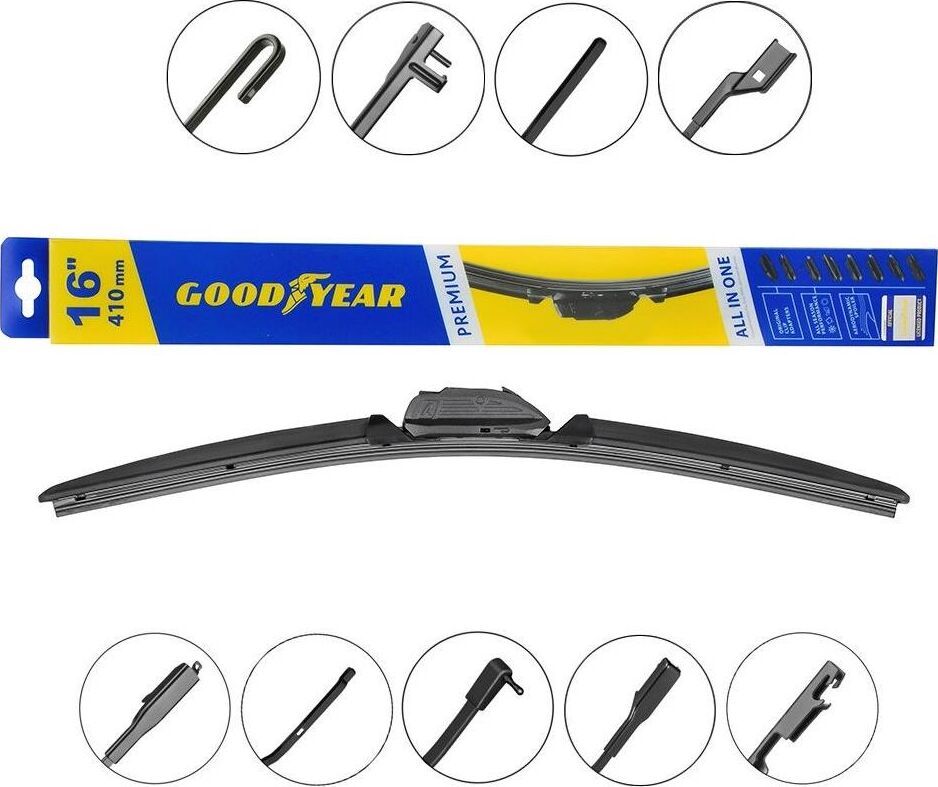 Уникальная система крепления адаптеров Clip Adapters (8 адаптеров на 11 видов крепления) позволяет использовать GOODYEAR PREMIUM на 99,8% всех моделей легковых автомобилей, в том числе с правым рулём. Резиновое лезвие класса Triple A (ААА). Лезвие проходит процедуру полировки удаление шероховатостей поверхности. Спойлер щетки Симметричный Упаковка щетки ПВХ