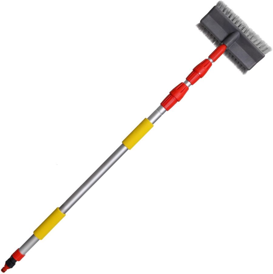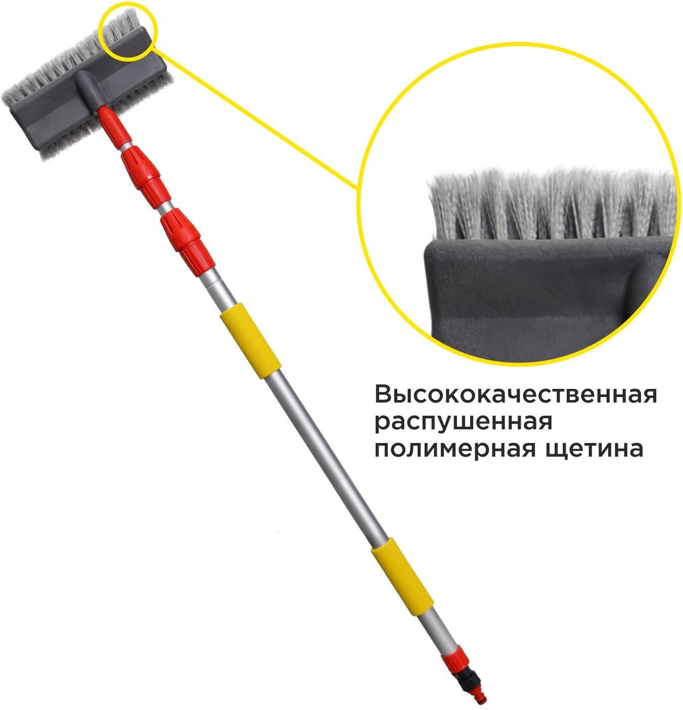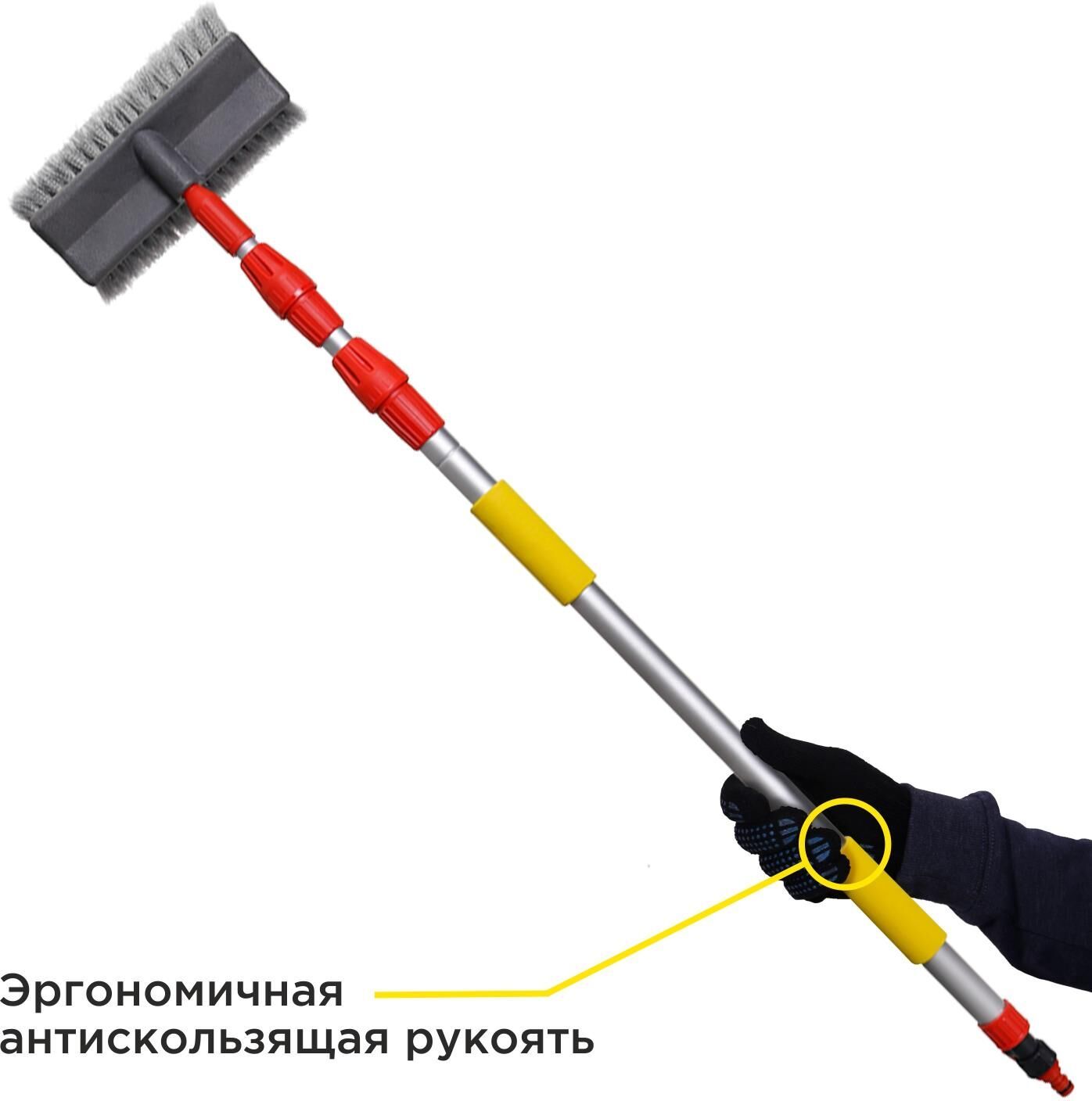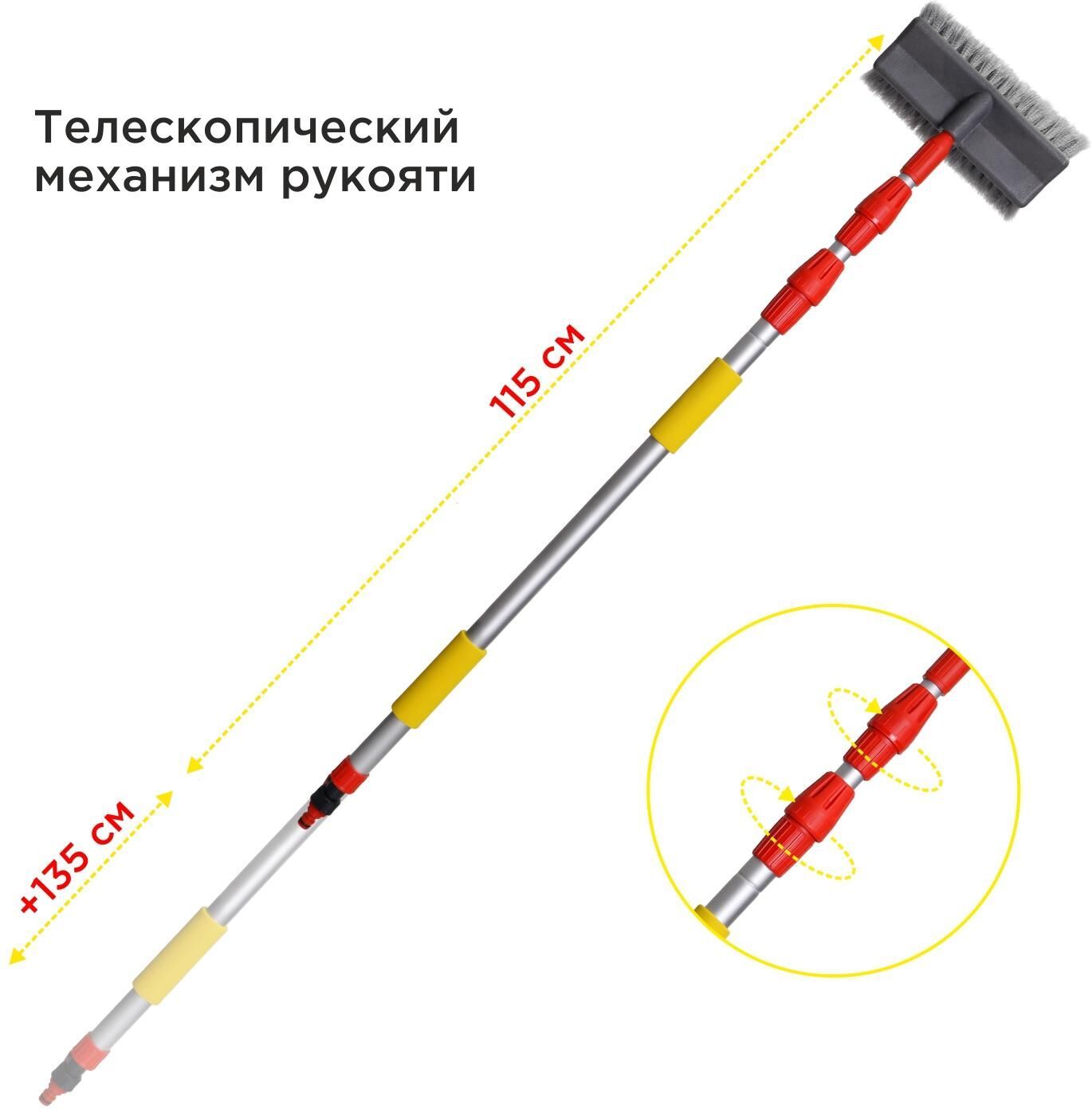 Возможность подключения к шлангу значительно ускоряет процесс уборки. Кран на рукоятке щетки позволяет регулировать напор воды. Рабочая поверхность щетки из мягкой длинной распушенной щетины образует обильную пену и обеспечивает деликатную очистку любых поверхностей. Телескопическая ручка выдвигается на необходимую длину для удобной очистки труднодоступных поверхностей. Длина швабры в сложенном виде - 115 см, в разложенном - 250 см. Выдвижной механизм оснащен плотным фиксатором, который удерживает заданную длину ручки во время эксплуатации. Основание рукояти из легкого метала обладает повышенной прочностью и не подвержено коррозии. Антискользящая накладка EVA обеспечивает удобный хват и комфорт во время эксплуатации. Особенности • Мягкая густая распушенная щетина • Возможность подключения к шлангу • Кран для регулирования напора воды • Регулируемая длина 115-25