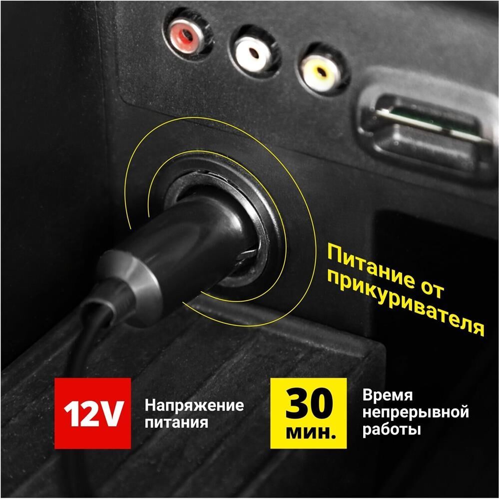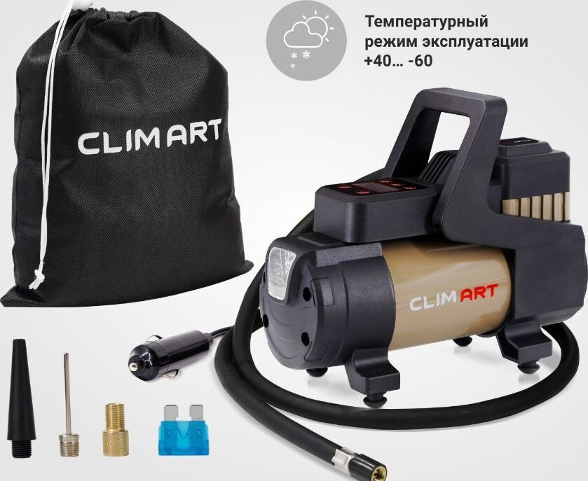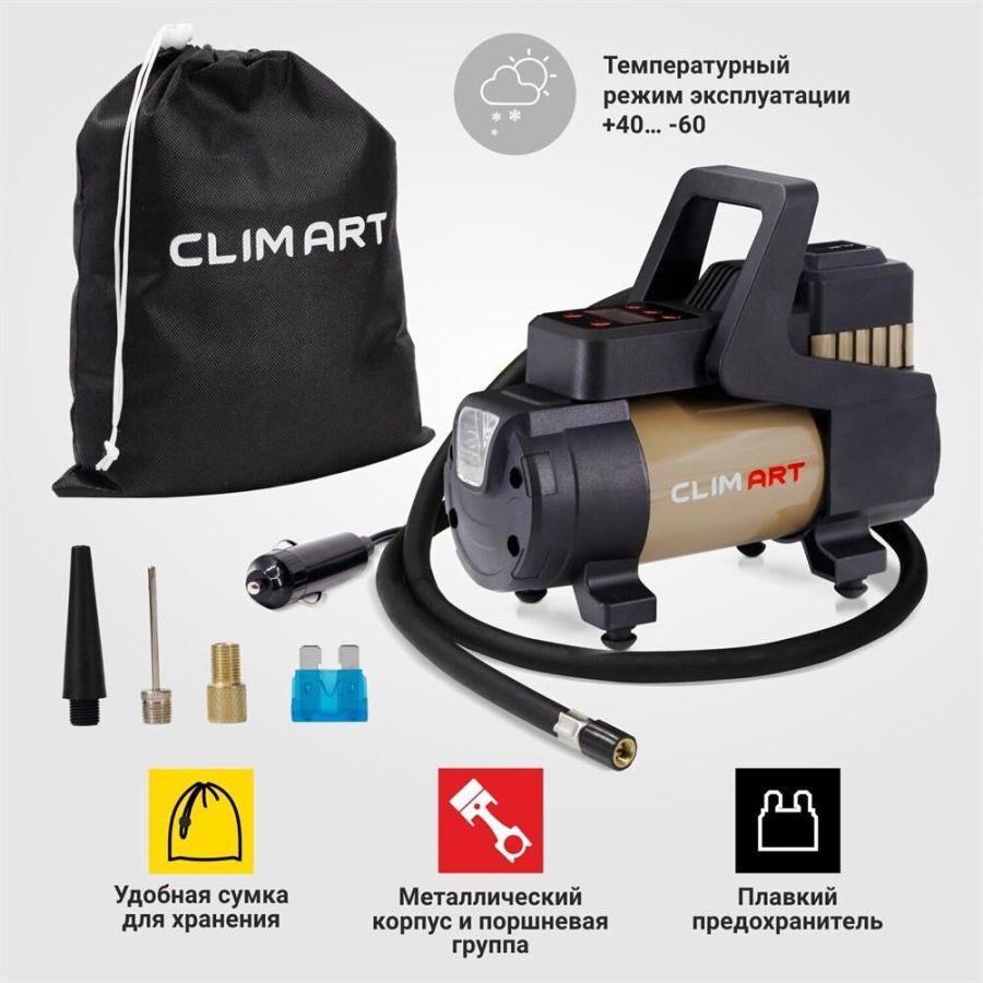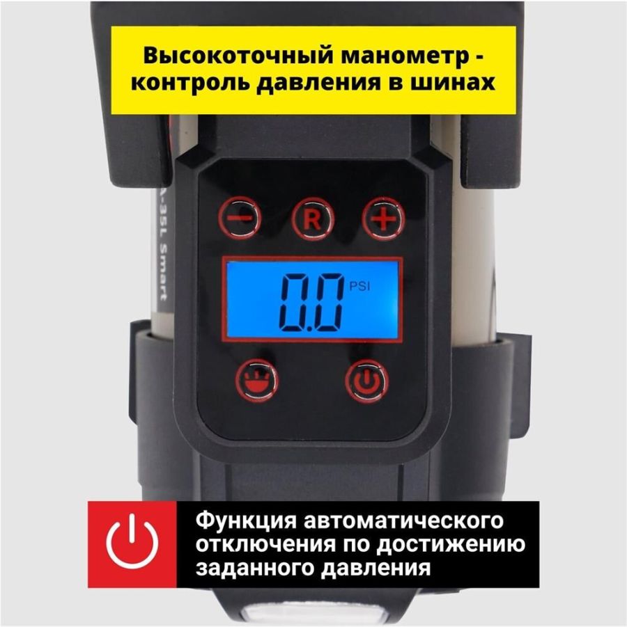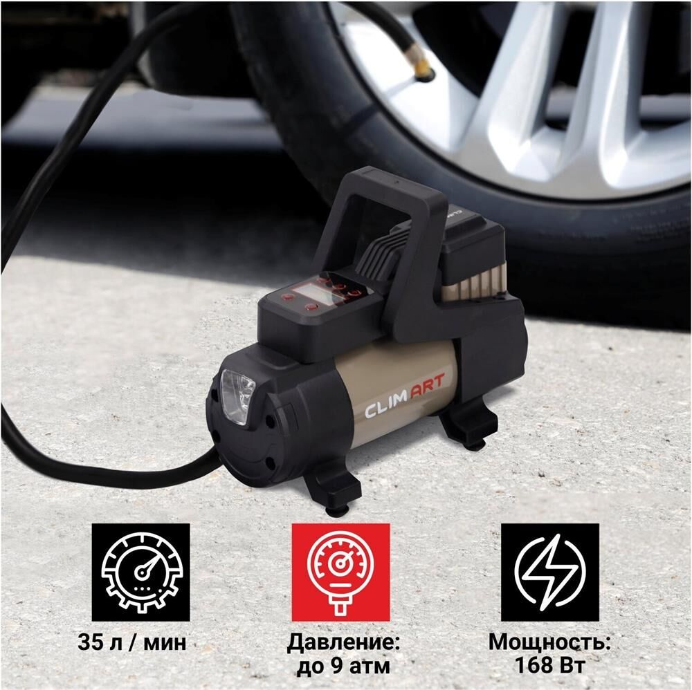 Автомобильный компрессор " Мощность: 168 Вт " Производительность: 35 л / мин " Давление: до 9 Атм " Максимальное токопотребление: 14 А " Питание: 12V " Длина провода питания: 3 м " Длина воздушного шланга: 1 м " Температура эксплуатации: -40… + 60 С° " Защита: плавкий предохранитель " Материал: Сталь " Вес: 1,50 кг " Объем: 0,002 куб.м " Металлическая поршневая группа " Высокоточный цифровой манометр " Функция автоматического отключения по достижению заданного давления " Универсальный автомобильный предохранитель в капсуле " Время непрерывной работы: 30 мин " Сумка-мешок для хранения и переноса компрессора " Переходники в комплекте " Фонарь Питается автокомпрессор от прикуривателя. Автомобильный предохранитель в капсуле защищает устройство и сеть автомобиля от скачков напряжения в случае нештатной работы компрессора.