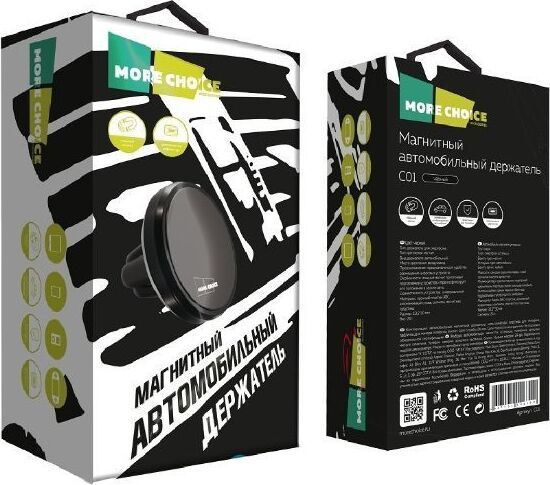 More choice C01 Держатель автомобильный магнитный Тип: держатель для смартфона Тип крепления: магнит Вид держателя: автомобильный Место крепления: воздуховод Предназначение: предназначен для удобства размещения цифровых устройств Особенности: мощный магнит притягивает портативное устройство и прочно фиксирует его положение в салоне авто Совместимость устройства: универсальный Материал: прочный пластик ABC, алюминиевый сплав, силикон, магнитная пластина Комплектация: автомобильный магнитный держатель, металлическая пластина для телефона, табличка для номера телефона, буклет Размер упаковки: 125*70*50 мм Вес: 26 г. Цвета: black, silver, red, gold