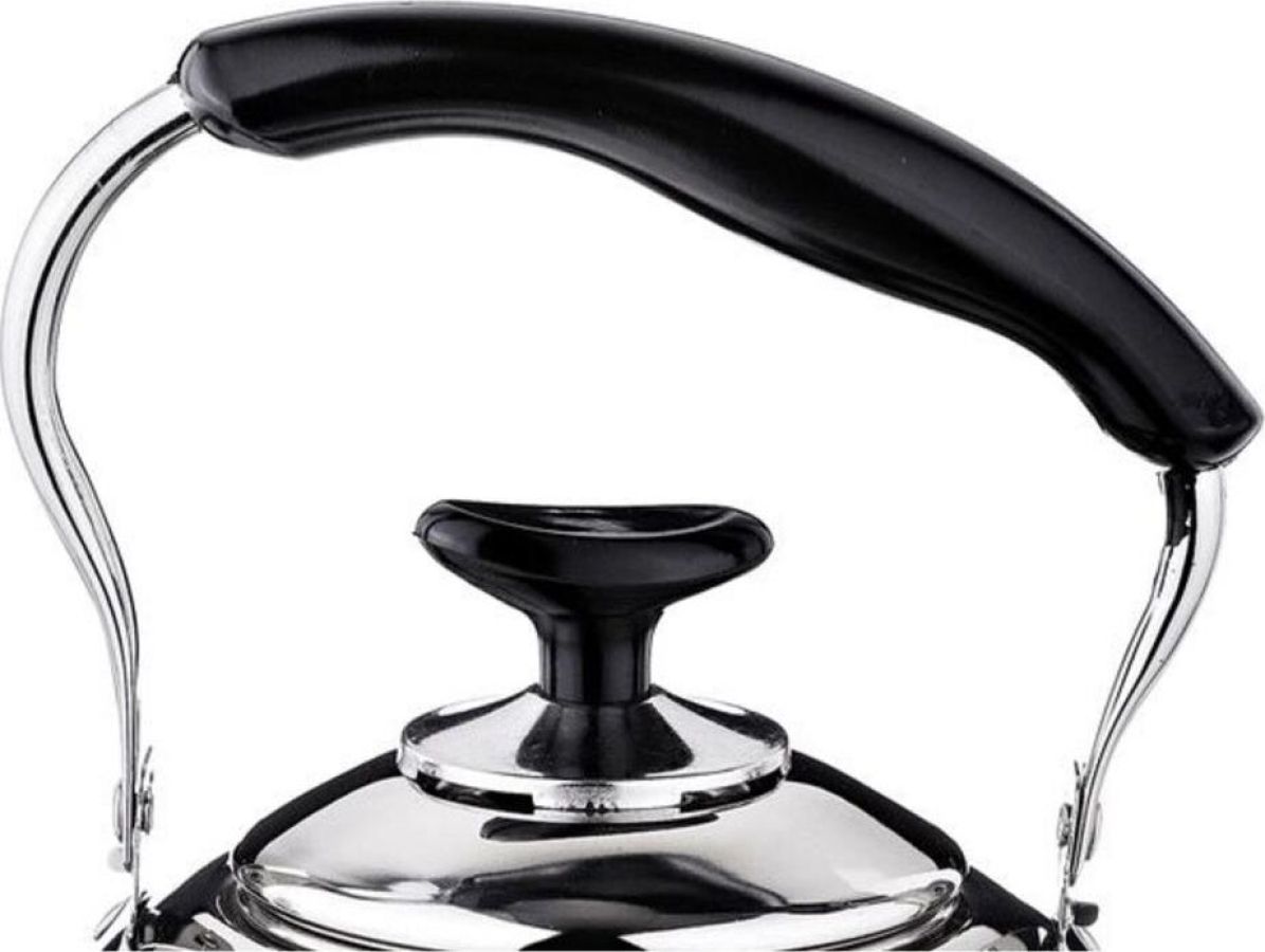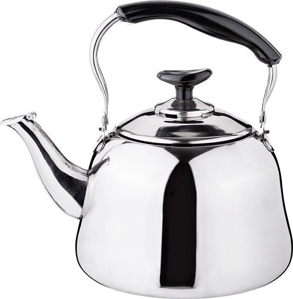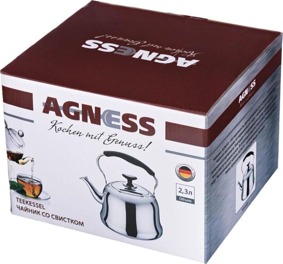 Чайник со свистком, изготовлен из нержавеющей стали.Посуда рассчитана на длительный срок эксплуатации. Имеет встроенный свисток . Объем 2,3л.