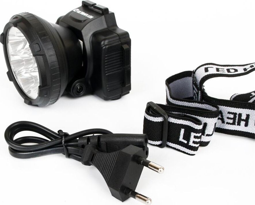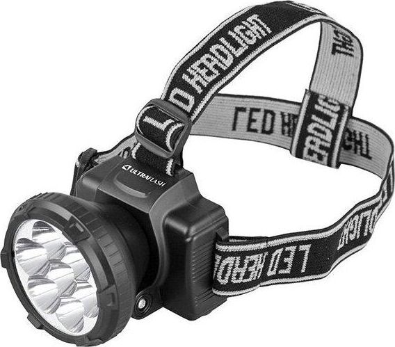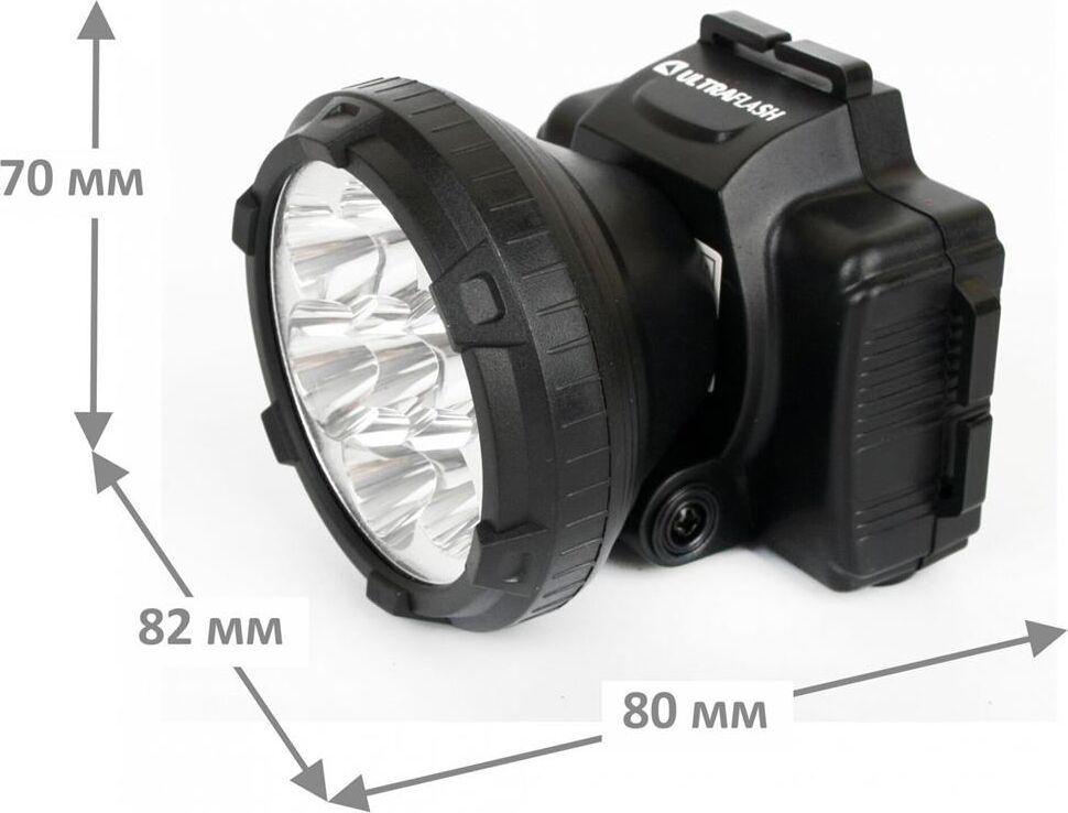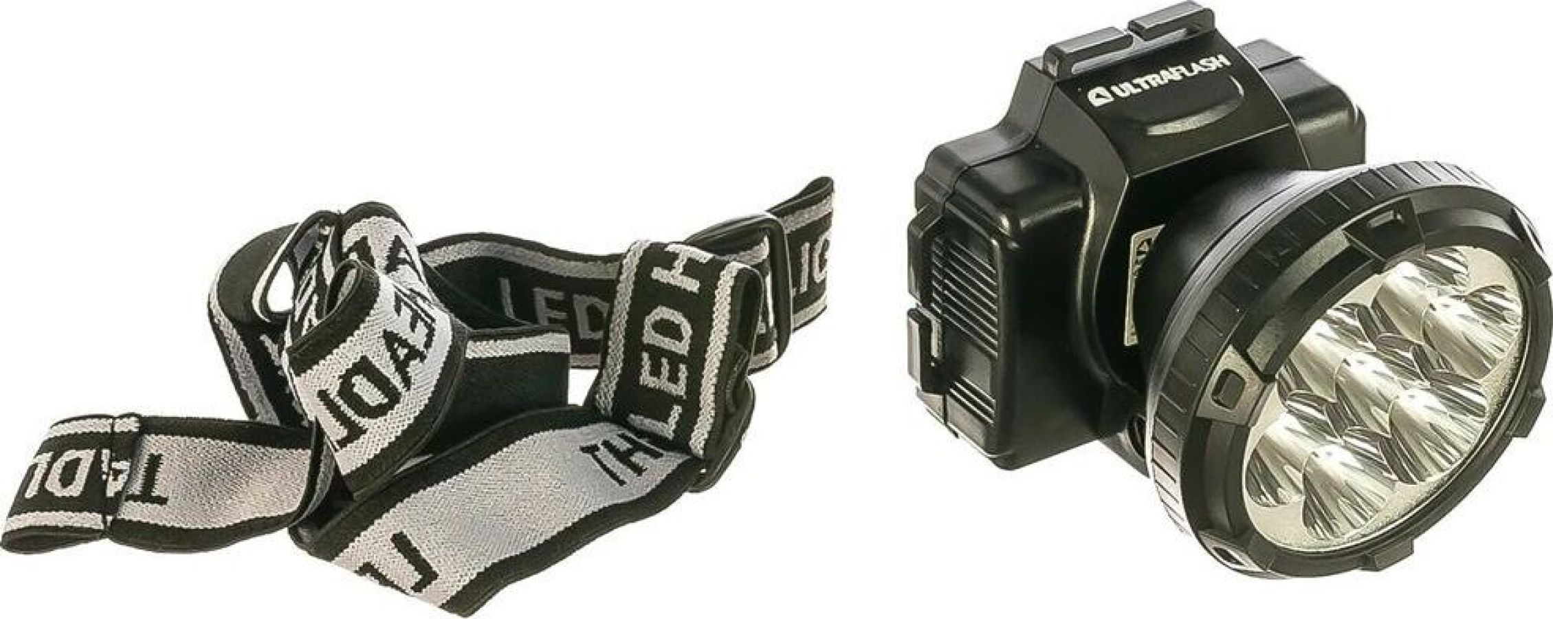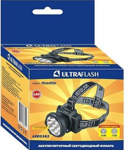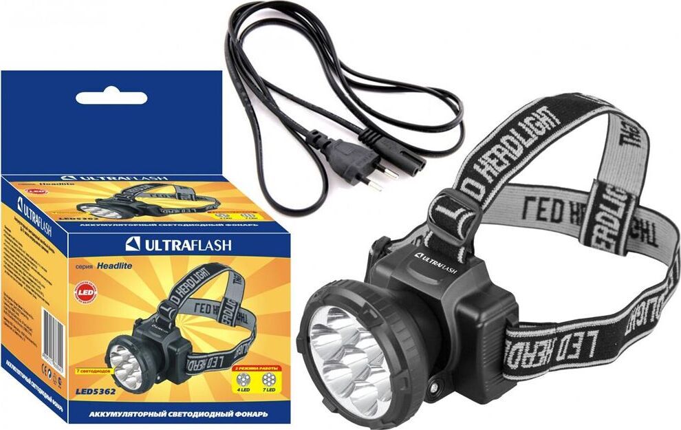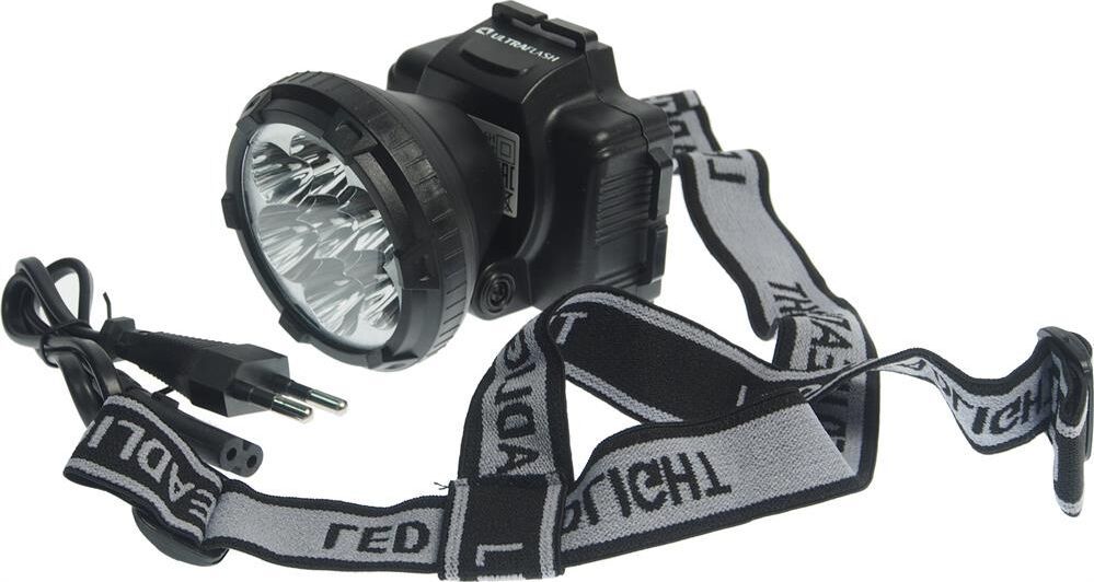 Фонарь Ultraflash электрический светодиодный налобный аккумуляторный. Цвет корпуса: матовый черный. Материал корпуса - пластик. Источники света: 7 светодиодов со световым потоком 30 люмен. Дистанция освещения - до 20 метров. Два режима работы. Выключатель: двухпозиционный кнопочный. Время работы при полностью заряженном аккумуляторе: 4 светодиода - до 9 часов, 7 светодиодов - до 5 часов. Время заряда - 7 часов. Комплектация: фонарь, свинцово-кислотный аккумулятор с напряжением 4 В емкостью 0,5 А-ч, сетевой кабель для заряда от сети ~220 В, поворотный отражатель, эластичный ремешок для ношения на голове, инструкция, упаковка. Степень пыле-влаго-защиты IP22. Упаковка - коробка. Максимальный линейный размер фонаря 7,5 см. Размер упаковки 9 см x 9 см x 8,2 см. Вес без упаковки 0,16 кг. Вес с упаковкой 0,22 кг.