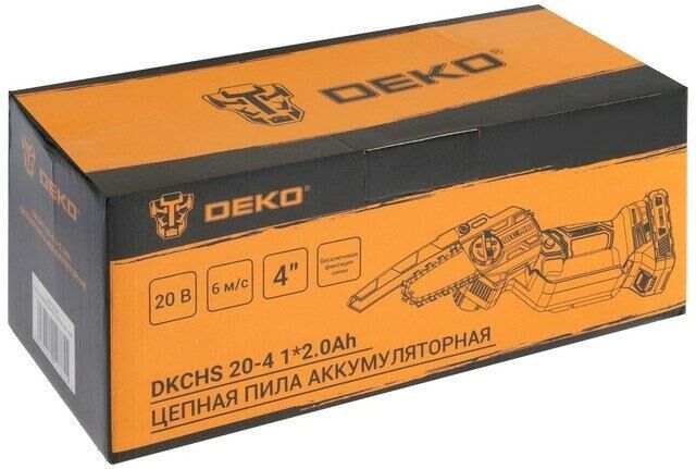 Тип аккумулятора: Li-Ion , Количество аккумуляторов в комплекте: 1 , Комплект поставки: Пила цепная аккумуляторная DEKO DKCHS 20-4, 063-4480 , Габариты (ШхВ): 115x240 мм , Класс инструмента: Полупрофессиональный