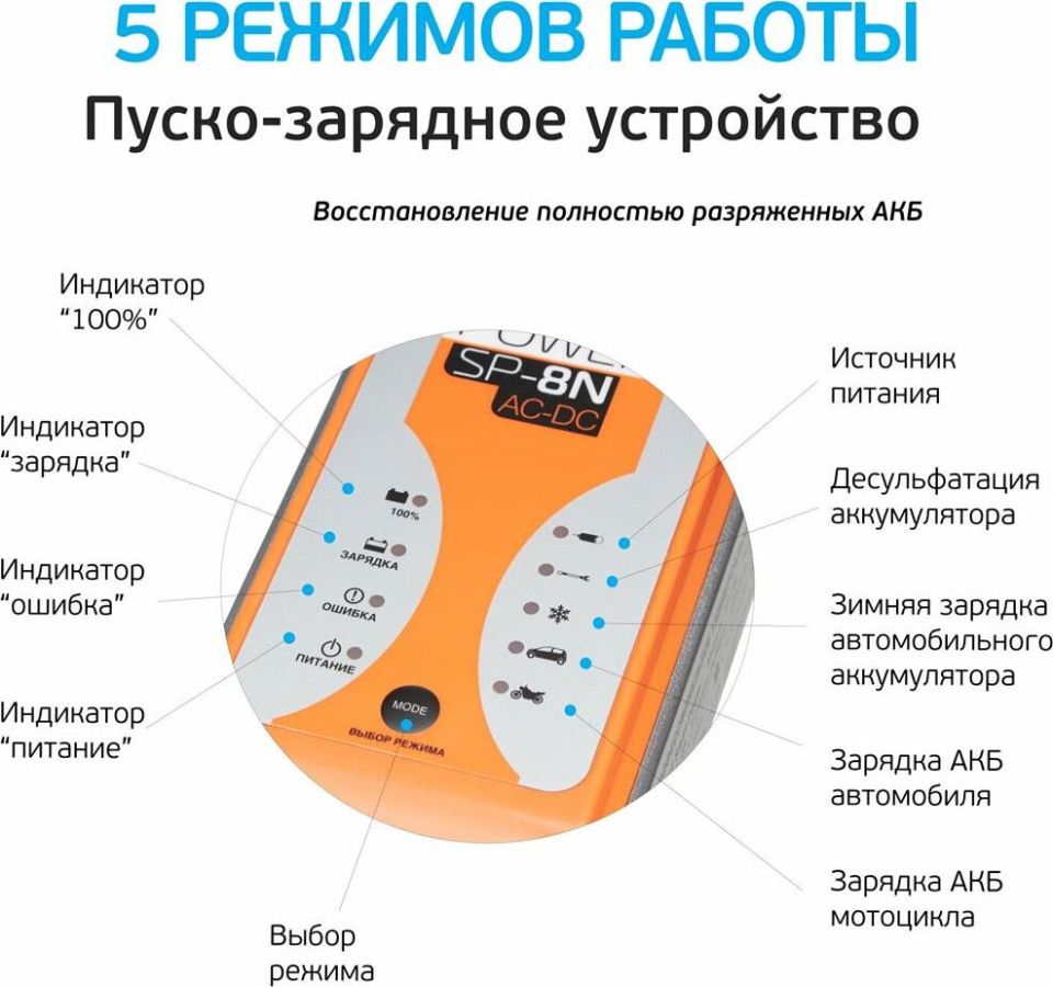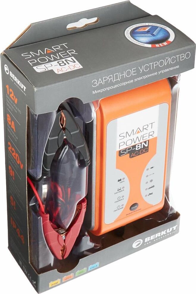 Подключение на входе бытовая сеть Напряжение на входе 220-240 В Выход Подключение на выходе клеммы Напряжение на выходе 14.4-14.7 В Ток на выходе 8 А Параметры батареи Емкость заряжаемой батареи 6-160 А*ч Поддерживаемые батареи все типы 12-ти вольтовых батарей (WET, MF, VRLA, Ca, AGM, GEL) Минимальный остаточный заряд батареи 2 В Особенности Индикатор заряда есть Индикатор питания есть Рабочая температура от -20 до +50°С Особенности 9 стадий зарядки + автоматический цикл, индикатор "ошибка" загорается при которком замыкании/неверной полярности/неисправном аккумуляторе, выбор режима работы,режим "зимняя зарядка" Корпус Класс защиты IP44 Ширина 95 мм Высота 60 мм Глубина 220 мм Вес 0.9 кг