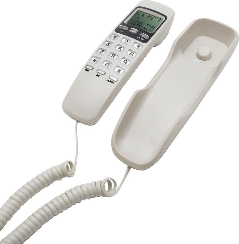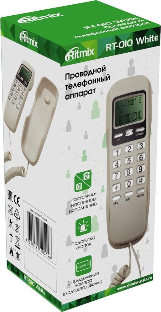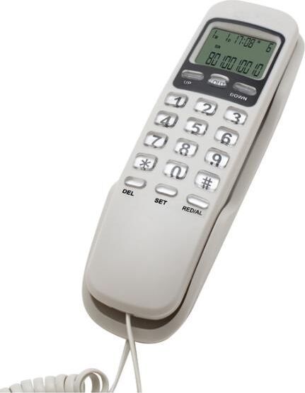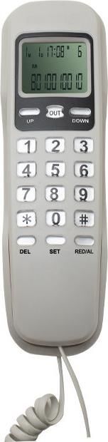 Проводной телефон с дисплеем, узкий корпус. Кнопки набора номера на базе. Пауза/ Повтор набора номера. Переключение. Системы определения номера входящего звонка (Caller ID), 32 входящих, 16 исходящих номеров в памяти. Импульсного /Тонового набора номера. Настольное и настенное крепление.