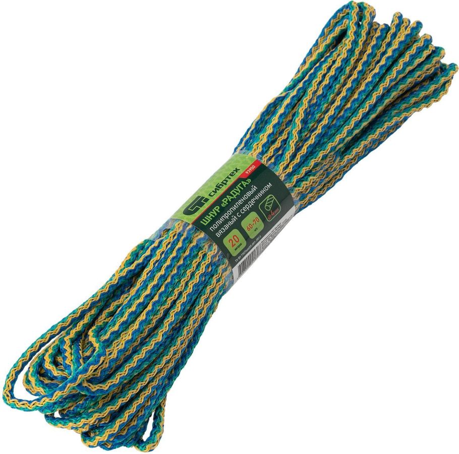 Вязаный полипропиленовый шнур с сердечником Сибртех «Радуга» 93950, диаметром 4 мм, длиной 20 м, будет полезен для хозяйственных нужд — сушки белья, связывания предметов, подвязки растений. Пригодится также в походе, на охоте или рыбалке. Благодаря сердечнику и высокопрочной оплетке вязаный шнур обладает повышенной устойчивостью к истиранию и разрыву — максимальная разрывная нагрузка составляет 60 кгс. Изделие не растягивается и не провисает под значительным весом.ПреимуществаПолипропиленовый шнур мягкий и эластичный, поэтому образует надежные узлы.Полипропилен практически не впитывает влагу, за счет чего шнур защищен от гниения.За счет наличия сердечника изделие устойчиво к многократному изгибанию, а значит, прослужит долго.Хозяйственный шнур устойчив к воздействию химических веществ, а также температурным перепадам, и может использоваться вне помещения.Длина 20 м позволяет протянуть шнур на большое расстояние или обвязать им габаритные предметы.