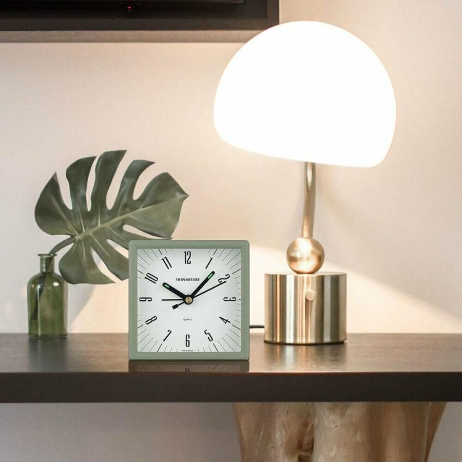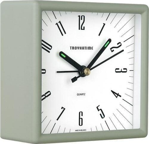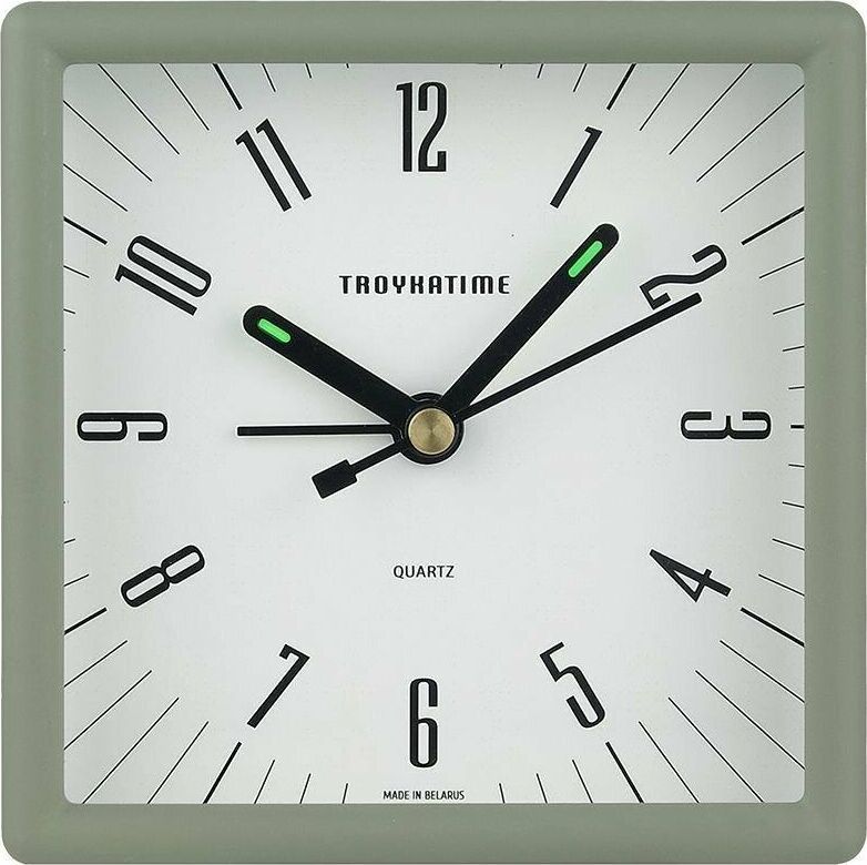 Настольные часы-будильник, пластиковый корпус, размер 95*95мм, кварцевый механизм с сигналом, цвет - хаки матовый.