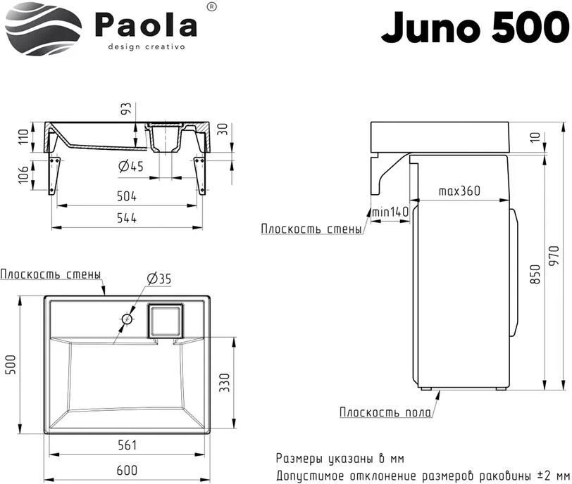 Подвесная раковина Paola Juno 500 на 2 кронштейнах предназначена для установки над стиральной машиной. Компактная, эргономичная, позволяет экономить площадь ванной комнаты. Раковина выполнена из прочного износостойкого литьевого мрамора, сверху покрыта специальным защитным покрытием гелькоутом. Исполнение поверхности Glossy Shine - изделие обладает глянцевым блеском, очень приятное на ощупь, прочное. Даже при минимальном уходе долго сохраняет безупречный цвет и внешний вид. В комплекте - выпуск, комплект из 2 кронштейнов и крепежей с инструкцией по монтажу, декоративный элемент, под которой спрятан слив, технический паспорт и гарантийный талон. Заводская гарантия составляет 5 лет, срок службы более 10 лет.