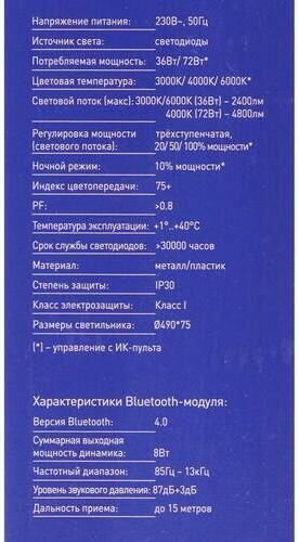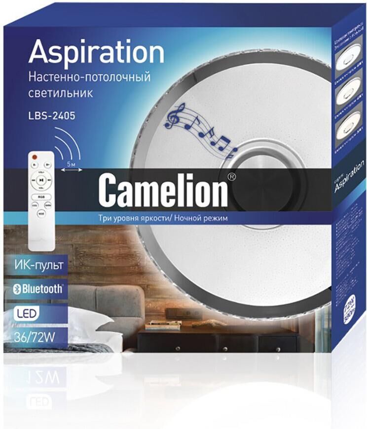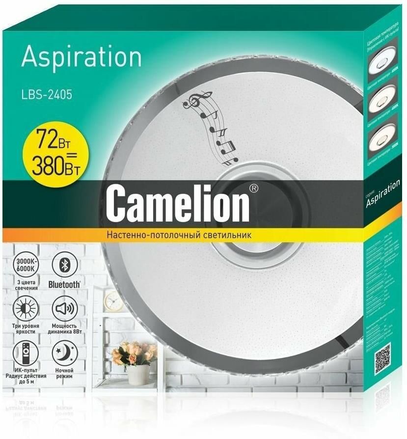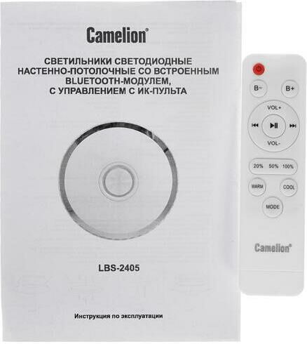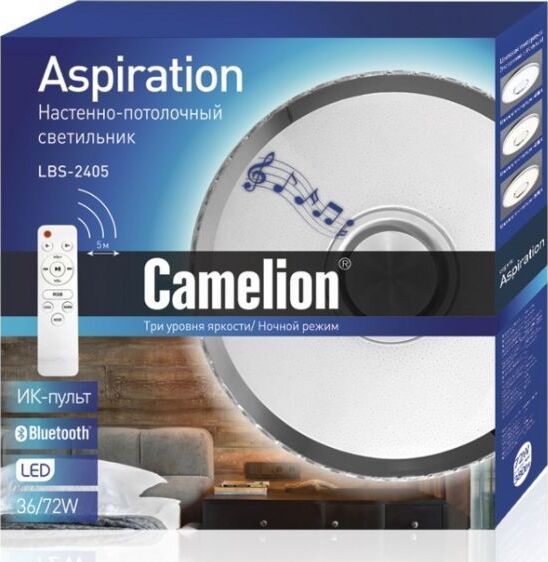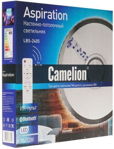 Настенно-потолочный Bluetooth LED светильник, в светильник встроена аудиоколонка , управляемый с пультом Camelion LBS-2405, диаметр 490мм, мощность 72Вт, аналог лампы накаливания - 380, световой поток - 2400-4800лм, цветовая температура 3000-4000-6000К, питание 230В / 50Гц