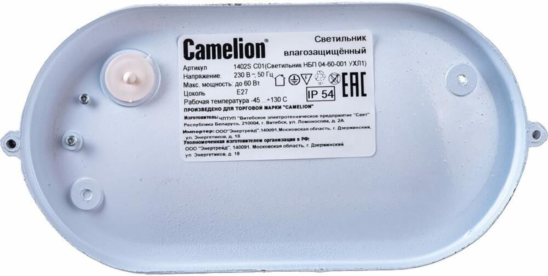 Влагозащищенный светильник Camelion 1402S C01, размер 205х100х80мм, источник света - ЛОН, тип лампы - 60/А/Е27, патрон - E27, мощность 60Вт, 230 В, 50 Гц. Литой алюминиевый корпус, каленое стекло и толстая силиконовая прокладка. Сборка и разборка может производиться бесконечно - конструкция надежна.