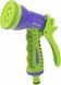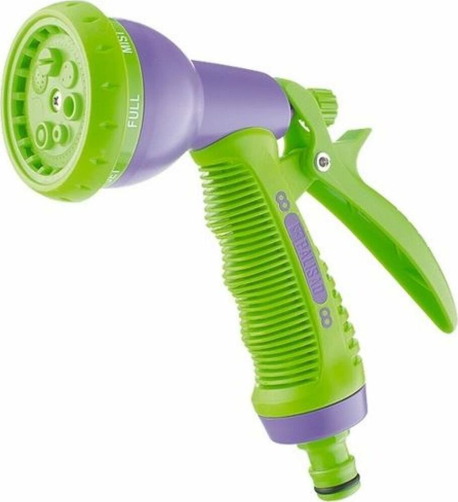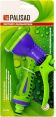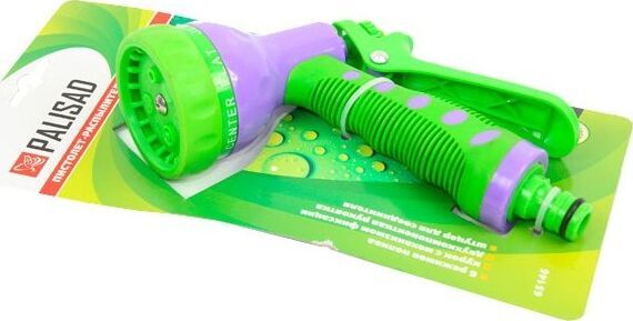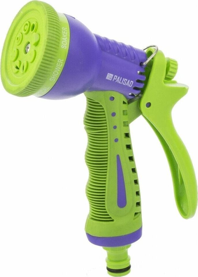 Пистолет-распылитель со штуцерной посадкой и курком, расположенным сзади. Оснащен регулируемой форсункой, что обеспечивает шесть режимов полива: душ, туман, конусную струю, центральную струю, плоско-горизонтальную струю, жесткую струю. Имеет фиксатор курка для непрерывной работы. Предназначен для всех типов полива на дачных участках, в садах, парках и скверах, а также для очистки. Совместим со всеми элементами системы полива Palisad и Palisad Luxe. Корпус и курок пистолета изготовлены из прочного АБС-пластика, рукоятка залита резиной, что обеспечивает максимальный комфорт при работе с инструментом.