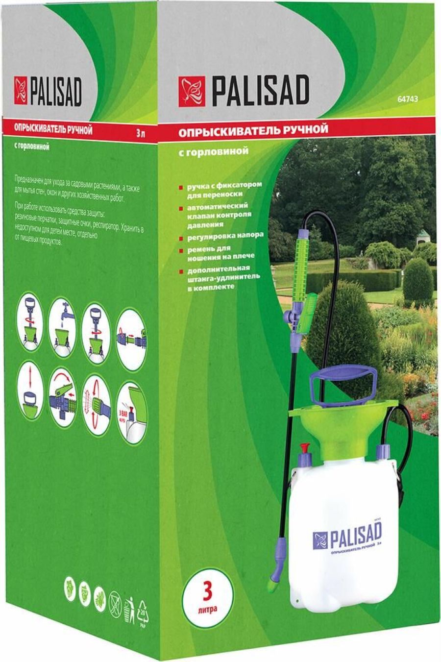 Опрыскиватель предназначен для обработки пестицидами, микрополива растений и внесения жидких удобрений в почву. Ручка опрыскивателя оснащена фиксатором для непрерывного полива. Автоматический клапан снижает излишнее давление внутри бачка. Широкая горловина обеспечивает быстрое и точное наполнение опрыскивателя. Преимущества: Помповый насос. Шланг. Разбрызгиватель. Регулировка распыления. Ремень для ношения на плече. Мерная шкала.