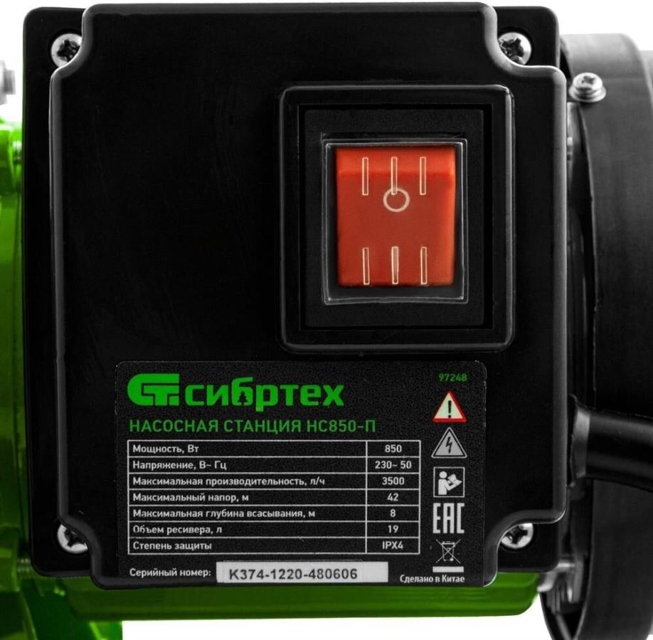 Глубина всасывания, м 8 . Диапазон рабочего давления, бар 1,4-2,8 . Максимальный напор насоса, м 42 . Материал корпуса насосной части пластик . Мощность, Вт 850 . Напряжение, В 230 . Объем ресивера, л 19 . Производительность, л/ч 3500 .