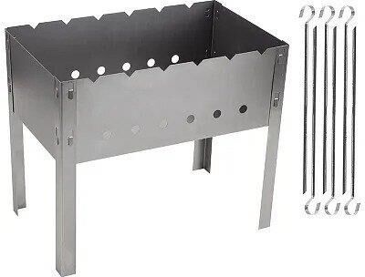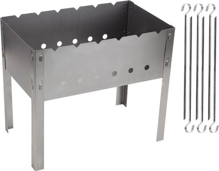 Размер мангала в сборе: 400х240х350мм; Материал: х/к сталь, толщина 0,50мм+/-10%; Размер шампура: 350*10мм; Материал шампуров: нержавеющая сталь 0,5мм; Количество шампуров: 6шт. угловые, без витка; Инд. упаковка: термоусадочная пленка, стикер;
