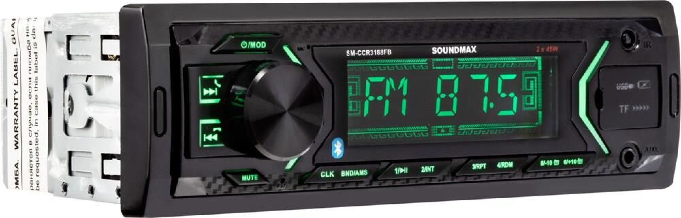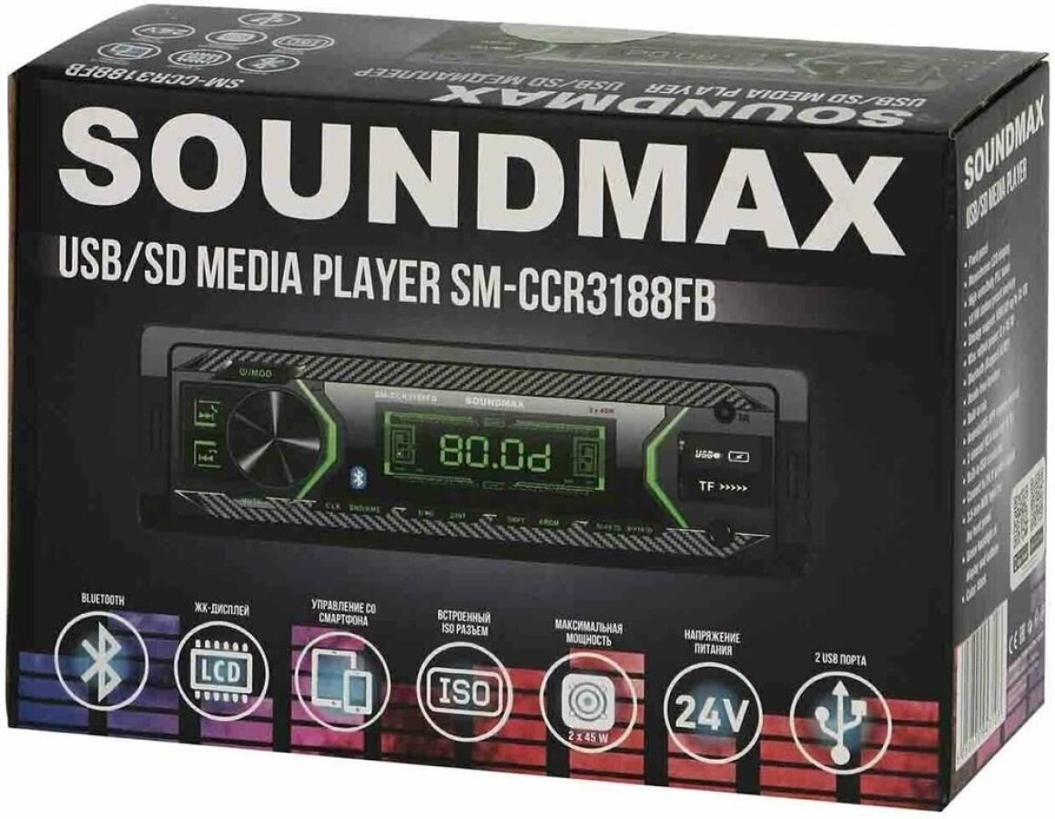 Автопроигрыватель FM-радио + Воспроизведение форматов MP3 Управление из мобильного приложения Android/IOS Диапазон частот FM 87,5—108 МГц Bluetooth + (аудио, handsfree) Воспроизведение потокового аудиосигнала (A2DP) + Микрофон встроенный Максимальная выходная мощность 2 х 45Вт Дисплей монохромный ЖК Подсветка кнопок зеленая Передняя панель фиксированная Поддержка карт памяти microSD Встроенный эквалайзер Classic, Pop, Rock, Jazz, Flat USB порт + (x2) Встроенные часы + Аудиовход AUX на передней панели Линейный RCA-выход + ISO-разъем + (с кабелем) Комплектация Ресивер, детали для установки, руководство пользователя Пульт дистанционного управления Приложение для Android/IOS Питание 24 В Цвет черный