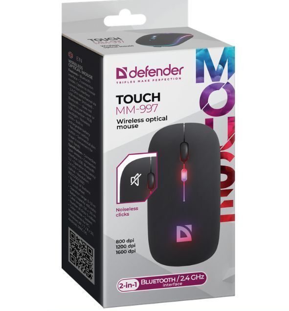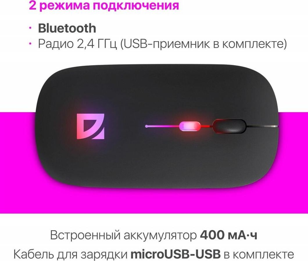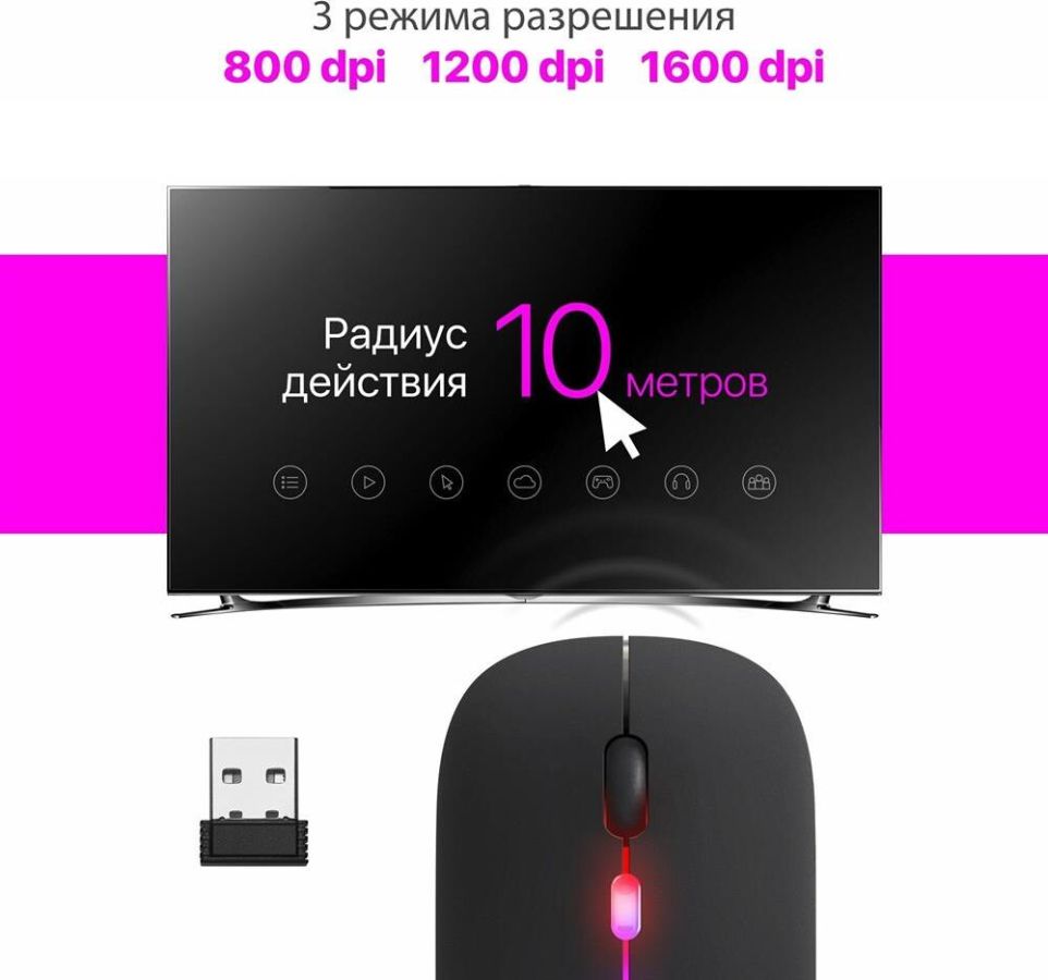 Тип подключения: беспроводной Интерфейс подключения: USB, Bluetooth Количество кнопок: 3 + колесо-кнопка Тип сенсора: оптический Разрешение сенсора мыши, DPI: 800 / 1200 / 1600 Разрешение: 800/1200/1600 Минимальное значение DPI: 800 Максимальное значение DPI: 1600 Количество нажатий: 5 миллионов Емкость аккумулятора: 400 мА·ч Бесшумные кнопки: есть Цвет: чёрный Длина кабеля: 0.8 ± 5% м ROHS / CE: Да Радиус действия: 0–10 м Масса индивидуальной упаковки: 0.11 кг Масса без упаковки: 0.06 кг Размеры без упаковки: 10.8 x 2.0 x 4.5 см Рабочая частота: 2.4 ГГц Системные требования для ПК: Windows XP / 7 / 8 / 10, Android, MAC OS Гарантийный срок: 6 месяцев