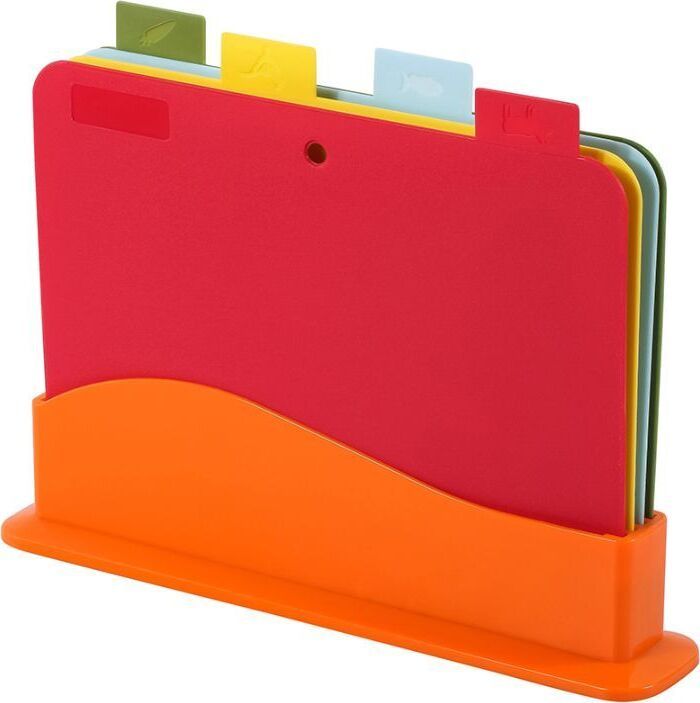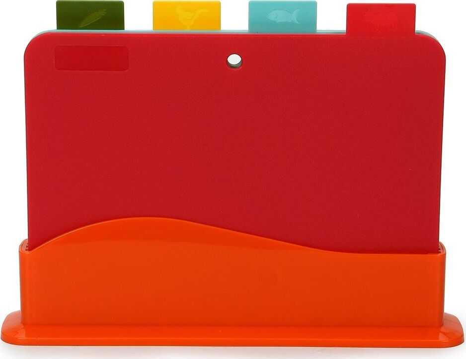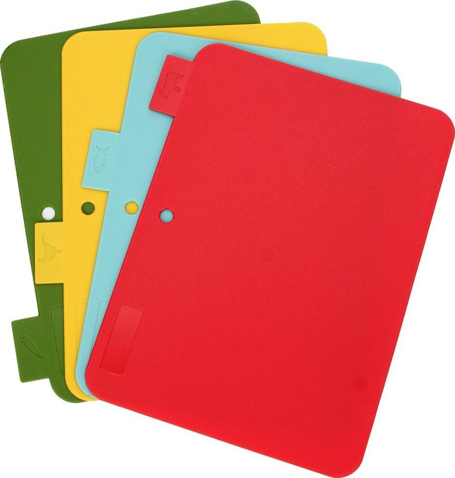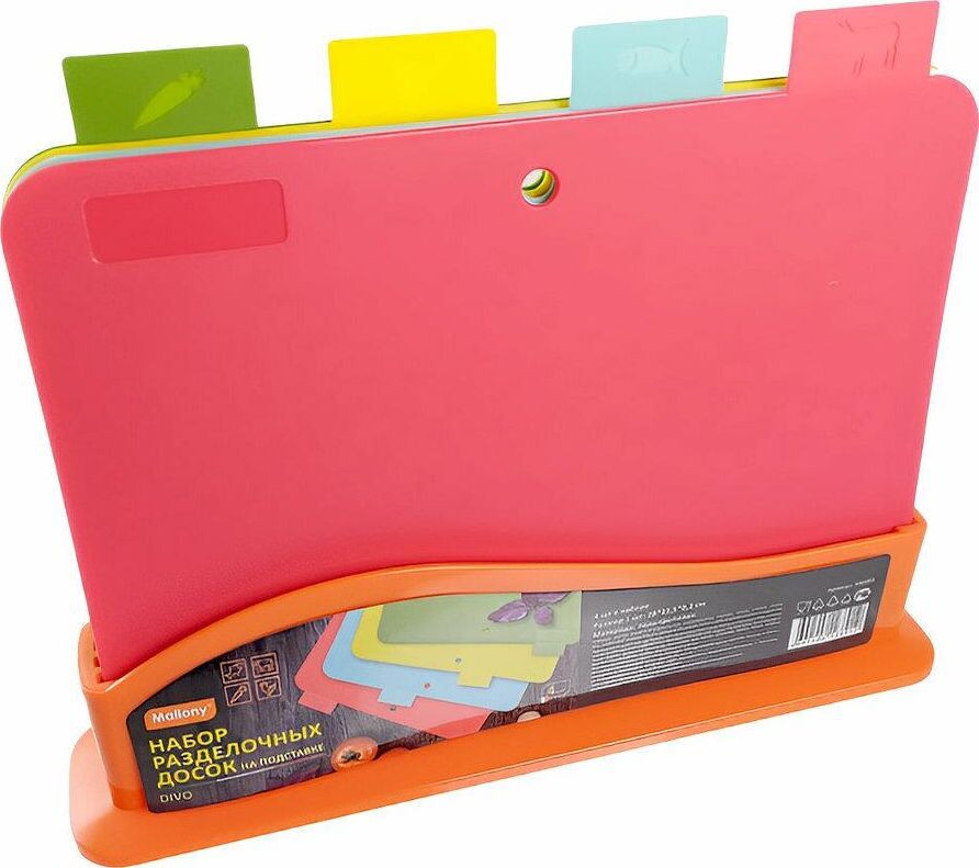 Набор разделочных досок 4 шт в наборе Каждая доска имеет специальную маркировку, что позволяет использовать ее для определенных продуктов Размер 1 шт: 29,00*22,5*0,2 см Вес набора: 630 гр Материал: полипропилен Упаковка: термоусадка с цветным стикером Преимущества: - прочный безопасный пластик; - 4 доски в комплекте; - удобная маркировка; - оптимальный размер; - компактное хранение в подставке.