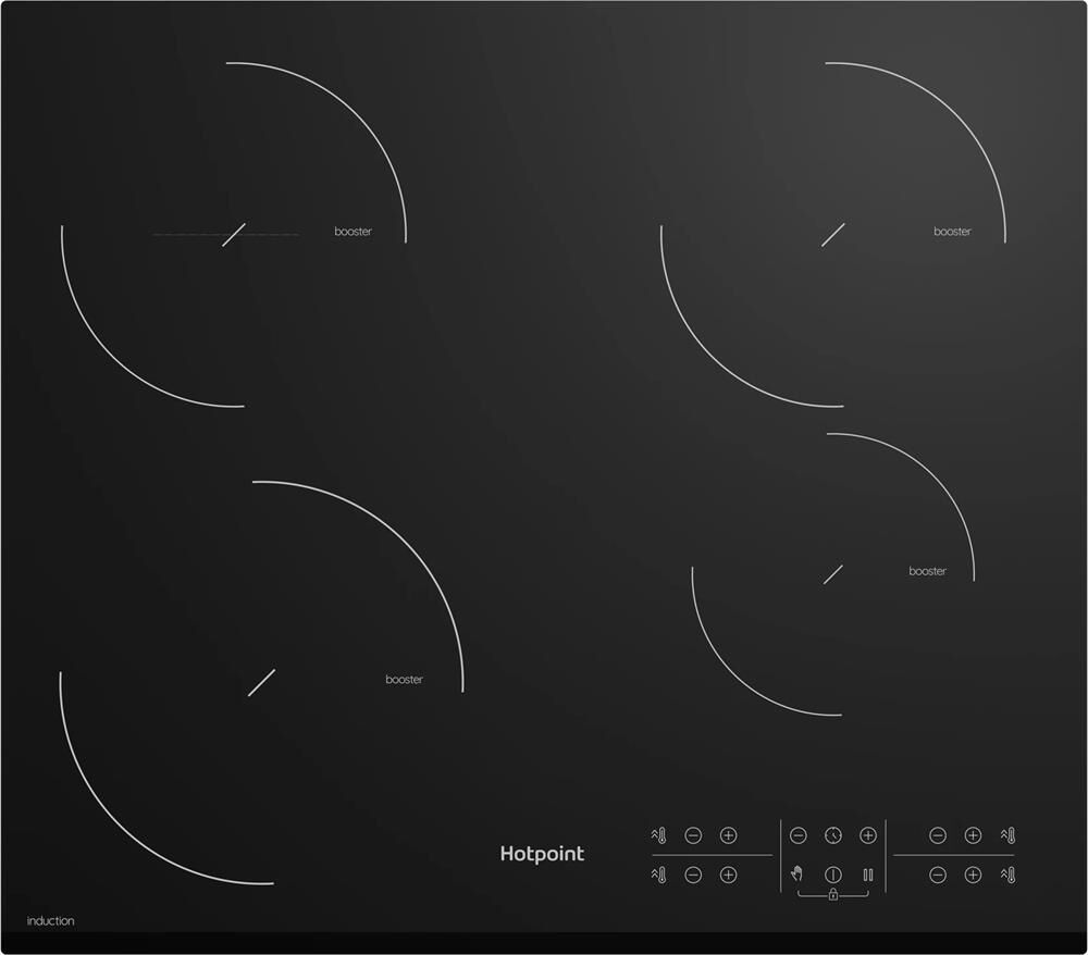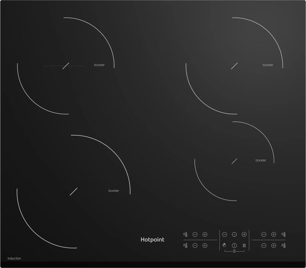 Индукционная варочная поверхность, 4 зоны нагрева, функция быстрого нагрева Booster, 9-ступенчатая регулировка мощности, сенсорное управление, таймер, функция блокировки управления, индикация остаточного тепла, передний скошенный край; цвет: чёрный