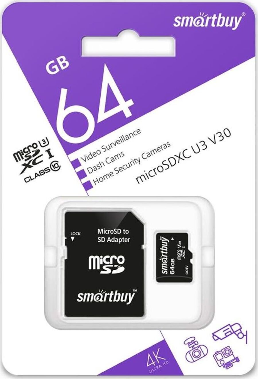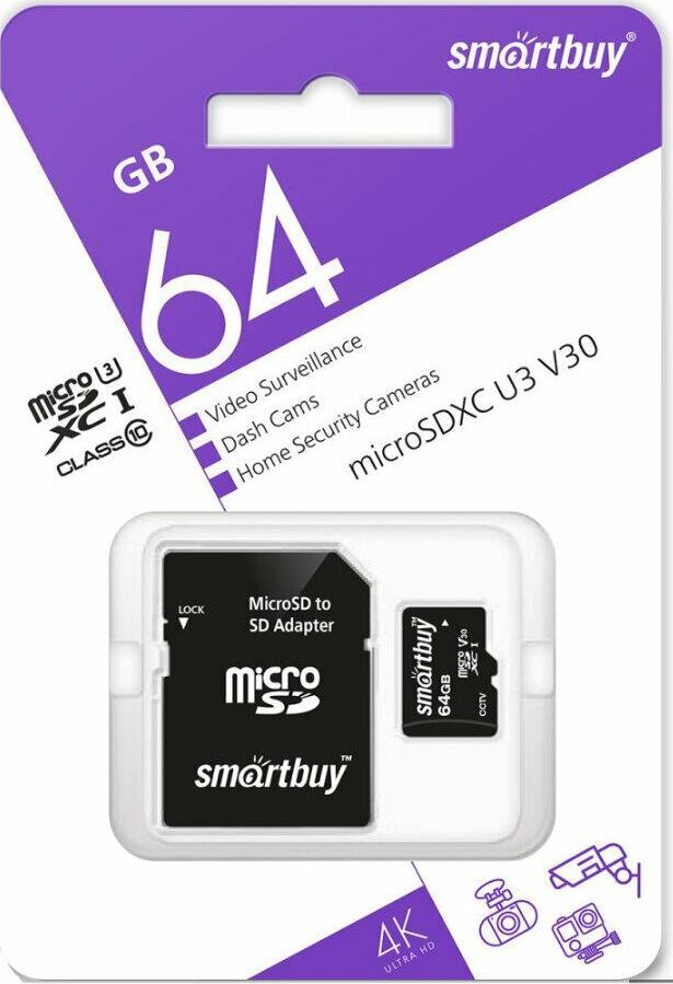 Карта памяти, объем памяти - 64GB, макс. скорость 50мб/с записи, 95мб/с чтения, Класс скорости 10 U3 (V30) Макс. Скорость чтения, Мб/с - до 95 Макс. Скорость записи, Мб/с - до 50, может быть использован для задач, связанных с интенсивной записью данных (например, видеорегистраторы или системы видеонаблюдения).