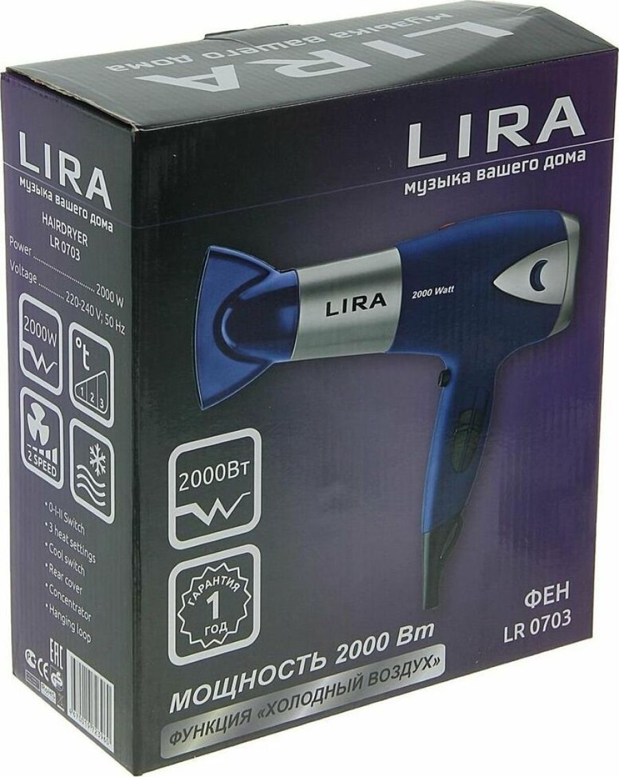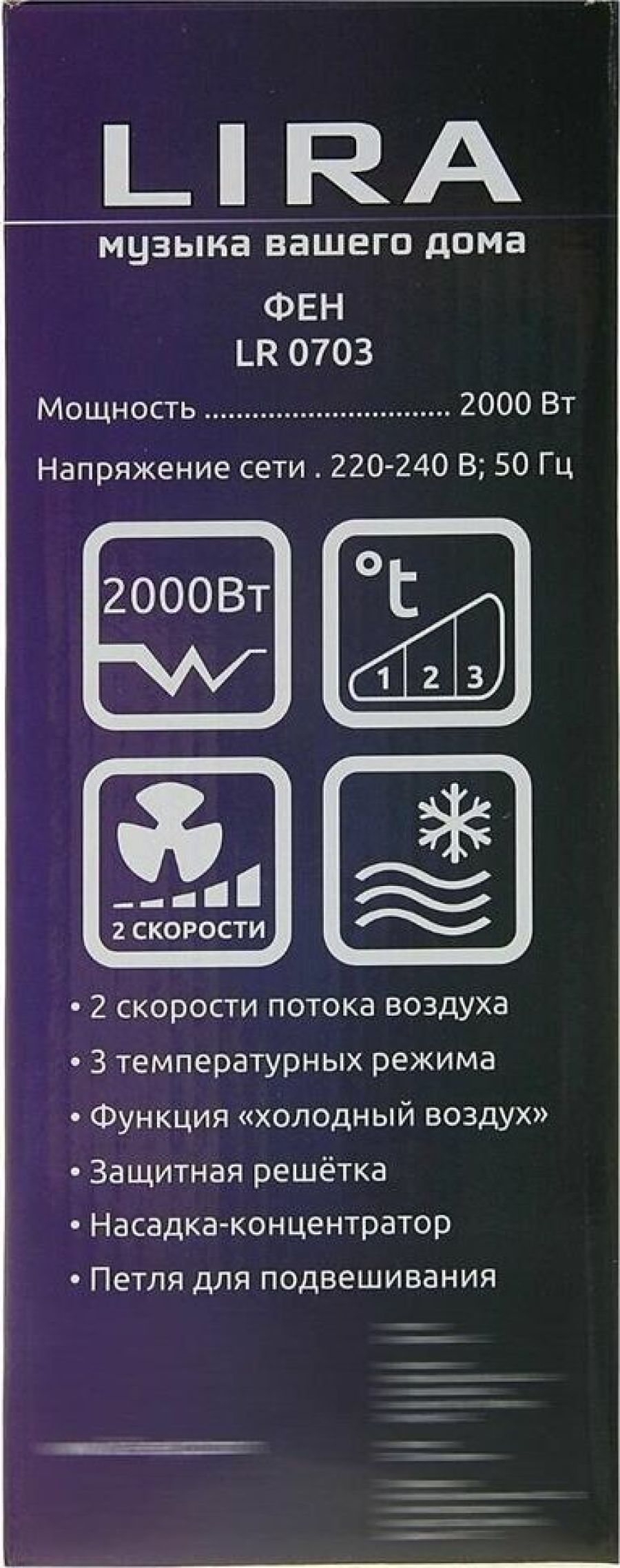 Мощность 2200 Вт, Напряжение сети 220 В, 2 скорости потока воздуха, 3 температурных режима, Функция «Холодный воздух», Защитная решетка, Насадка-концентратор, Петля для подвешивания.